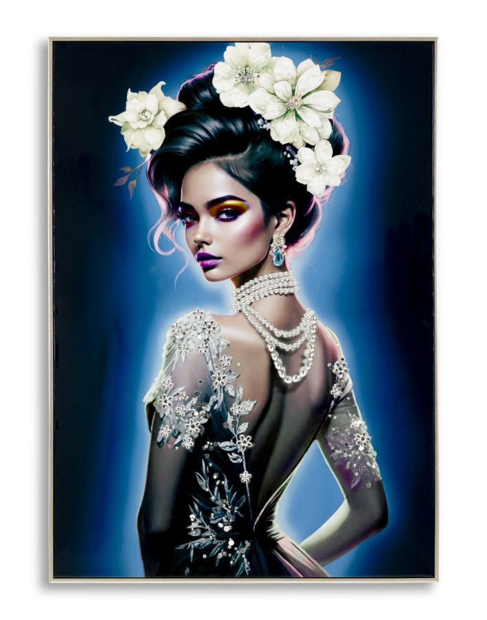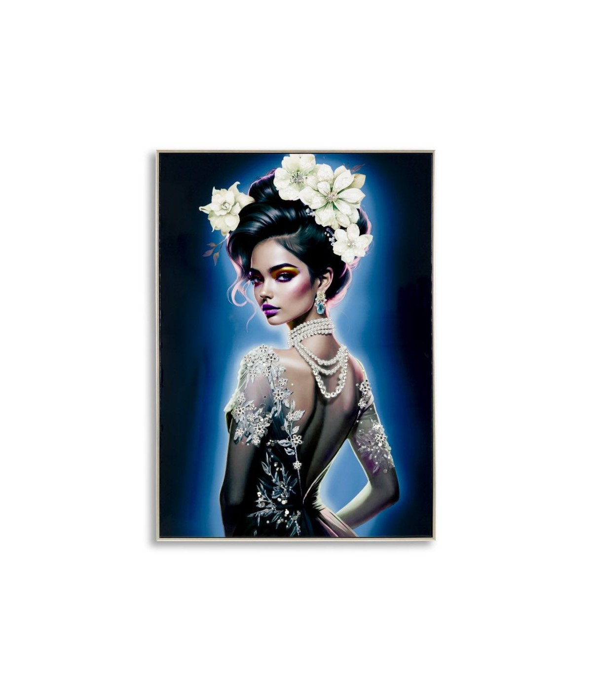 Dipinto su tela laccato con cornice Isabel esprime eleganza e raffinatezza senza tempo. La figura femminile, adornata con fiori e gioielli scintillanti, trasmette grazia e lusso. Perfetto per ambienti sofisticati, aggiunge un tocco di charme e femminilità.