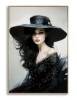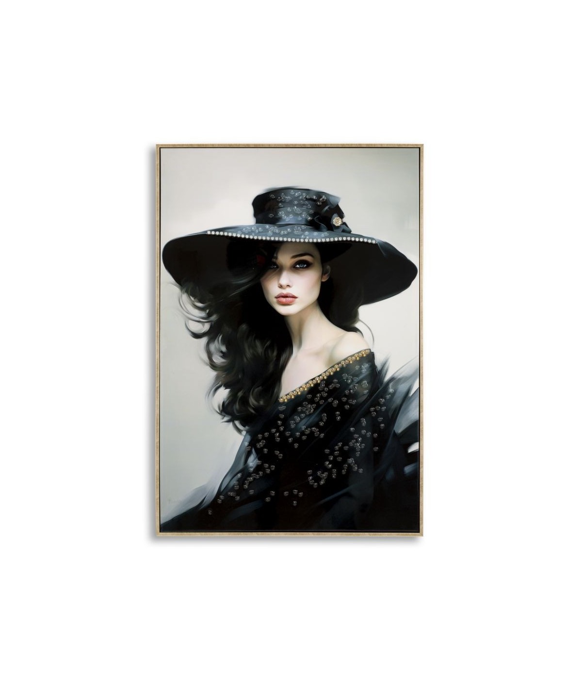 Dipinto su tela laccato con cornice Dori incarna fascino e mistero. La figura femminile, avvolta in un elegante abito nero e un cappello sofisticato, trasmette un’aura di eleganza e seduzione. Perfetto per ambienti raffinati, dona un tocco di glamour e profondità.