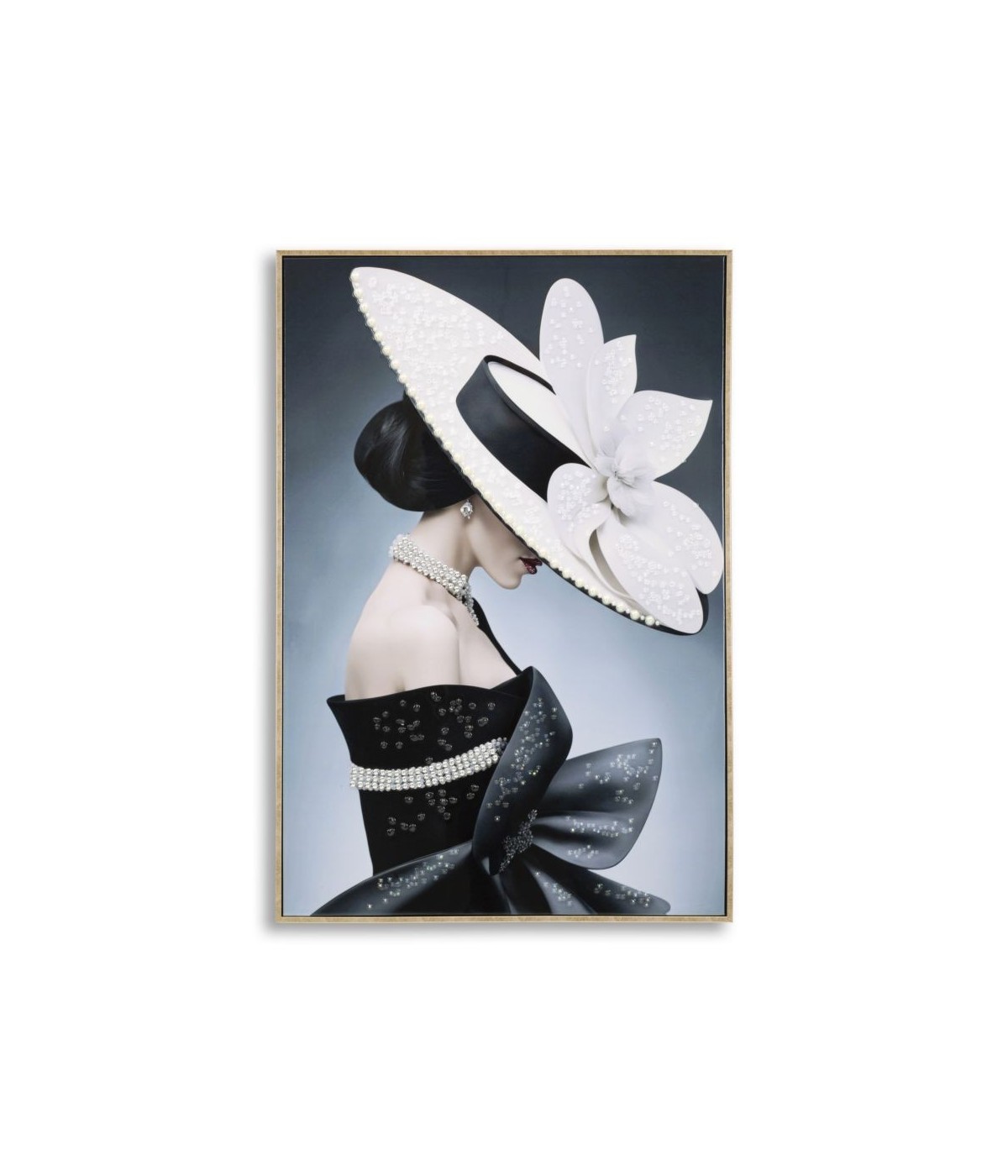 Dipinto su tela laccato con cornice Marty incarna raffinatezza e stile senza tempo. La figura femminile, con un elegante cappello a tesa larga decorato e un abito nero sofisticato, trasmette fascino e mistero. Perfetto per ambienti chic, dona un tocco di classe ed esclusività.