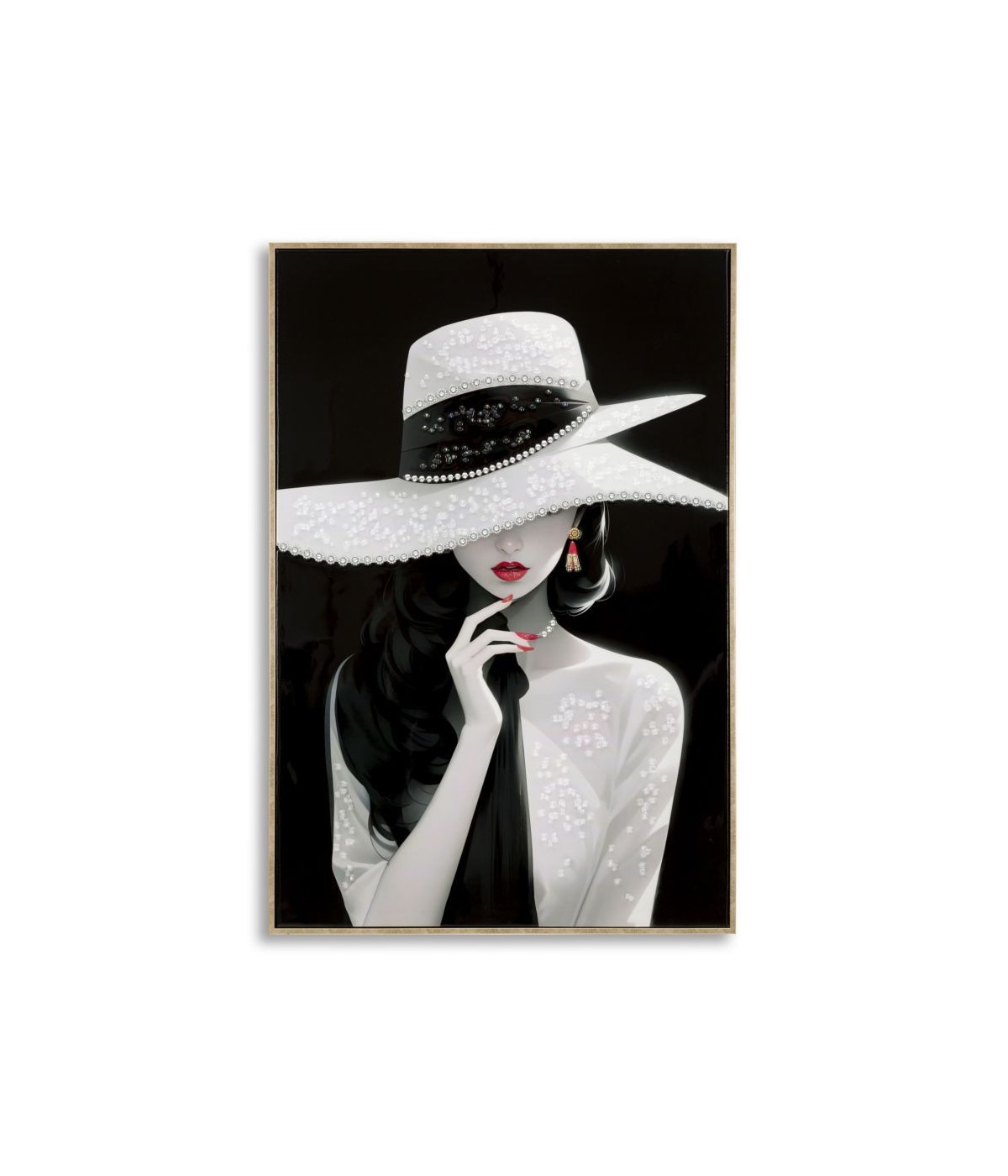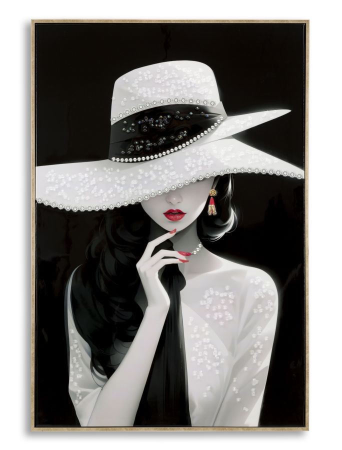 Dipinto su tela laccato con cornice Marty esprime eleganza e mistero. La figura femminile, con un ampio cappello bianco e labbra rosse in contrasto, evoca fascino e raffinatezza senza tempo. Perfetto per ambienti glamour, aggiunge un tocco di classe e seduzione.