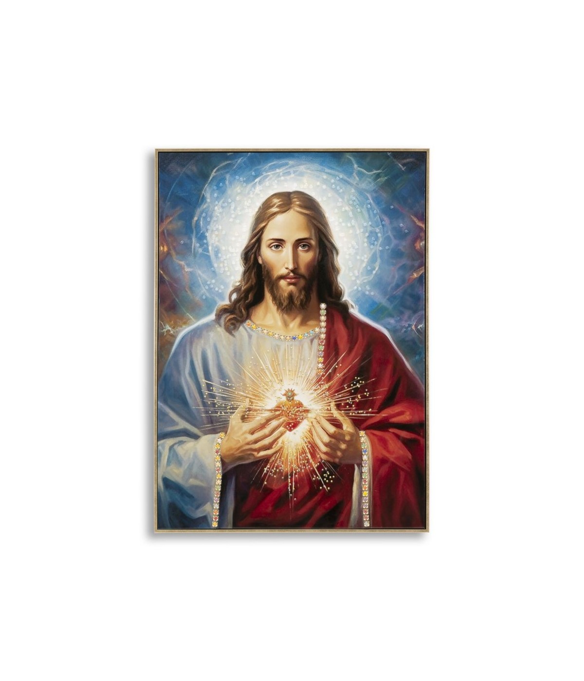 Dipinto su tela laccato con cornice Jesus trasmette spiritualità e compassione. L'immagine del Sacro Cuore irradia luce e amore divino, evocando fede e protezione. Perfetto per ambienti di preghiera o spazi dedicati alla riflessione, dona un tocco di pace e sacralità.