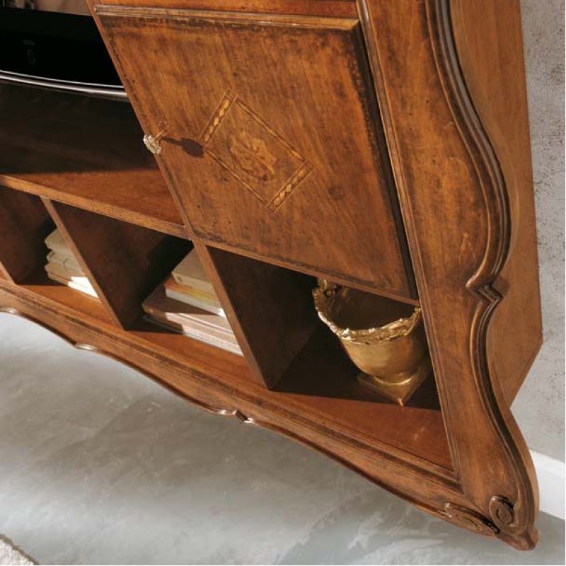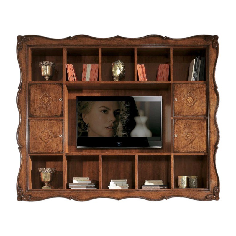 Parete porta tv sospesa con cornice sagomata dotata di dieci vani a giorno e quattro chiusi da quattro porte intarsiate per riporre libri, componenti in vetro, porta foto e oggetti da collezione. Realizzata con un vano a giorno centrale da inserire il televisore ideale per la zona giorno dove trascorriamo la maggior parte dei momenti guardando un film con la famiglia e gli amici.