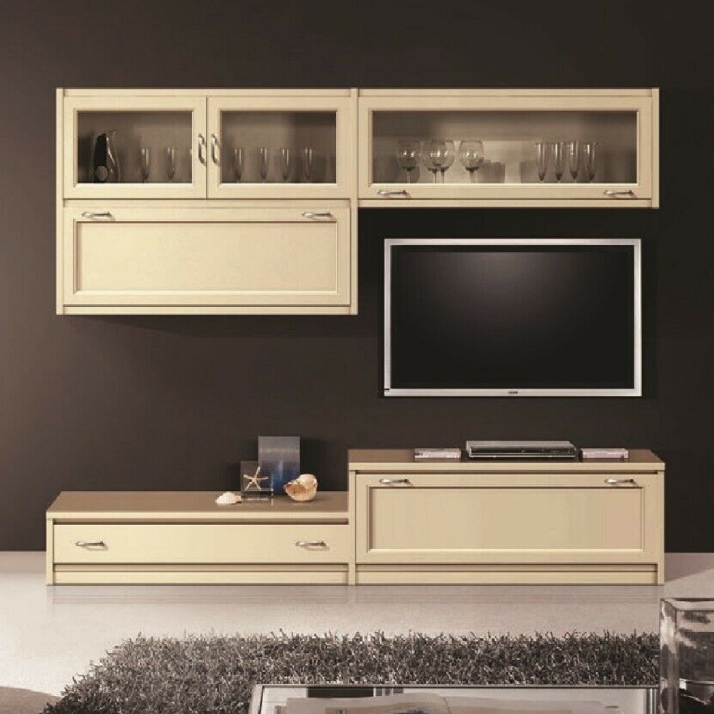 Parete attrezzata dalle linee semplici e pulite costruita in legno che lascerà a bocca aperta gli ospiti. Progettato per riunire eleganza e praticità arredando in un' unica composizione il salotto. Trovano facilmente posto nella zona giorno grazie ai suoi pensili per esporre oggetti in vetro e da collezione, le sue porte per inserire vari oggetti grazie ai suoi spazi interni. Parete unica nel suo genere ideale per passare del tempo guardando un film con parenti e amici .