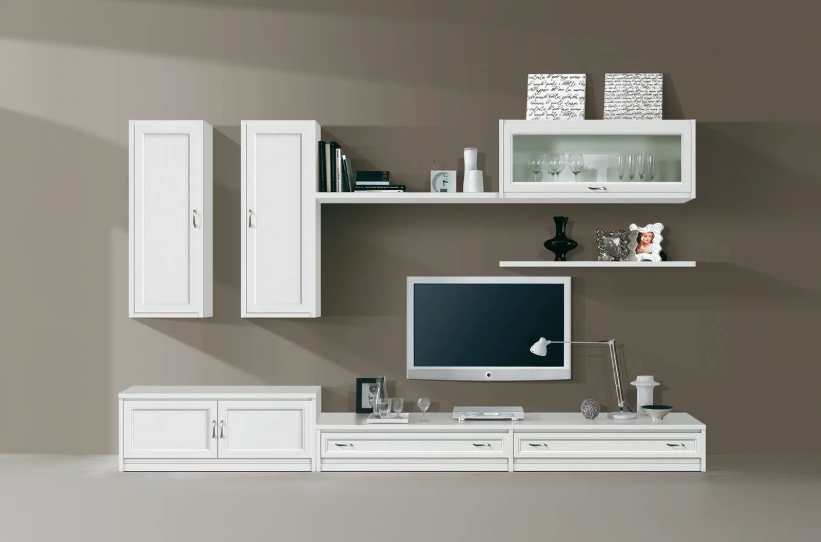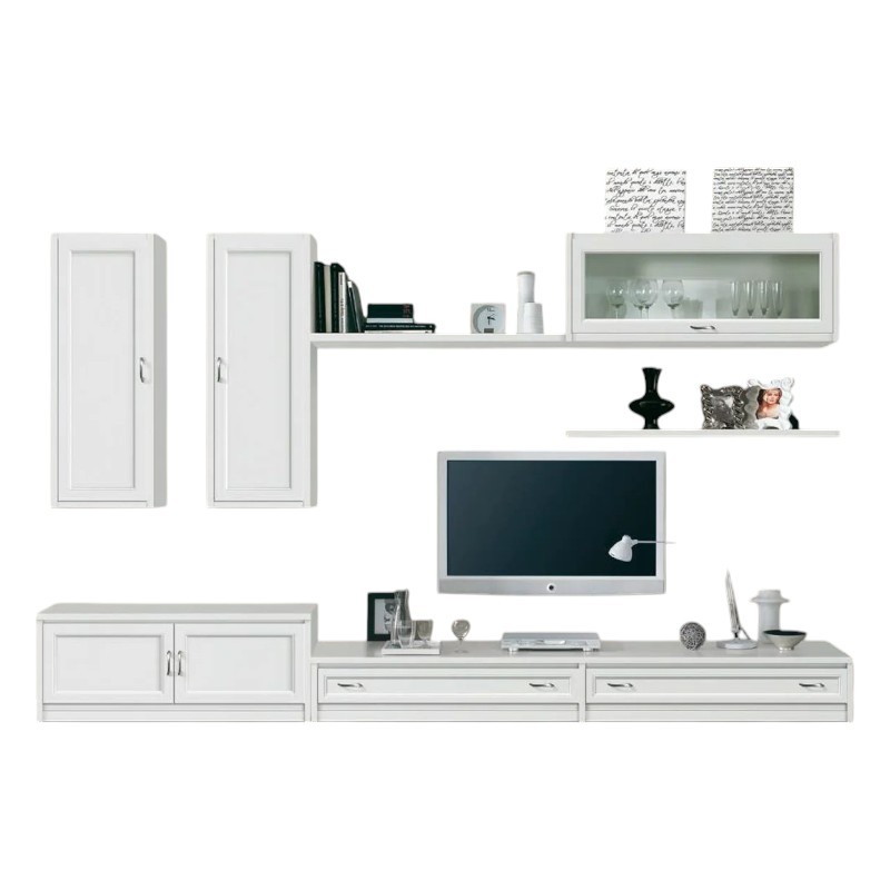 Parete attrezzata dalle linee semplici e pulite costruita in legno che lascerà a bocca aperta gli ospiti. Progettato per riunire eleganza e praticità arredando in un' unica composizione il salotto. Trovano facilmente posto nella zona giorno grazie ai suoi pensili in legno e vetro per esporre oggetti in vetro e da collezione, affiancata da due cassetti, due ante e due mensole per inserire vari oggetti grazie ai suoi spazi interni. Parete unica nel suo genere ideale per passare del tempo guardando un film con parenti e amici .