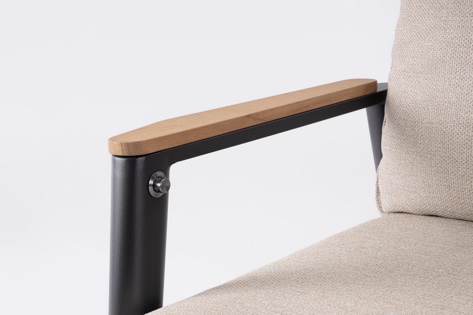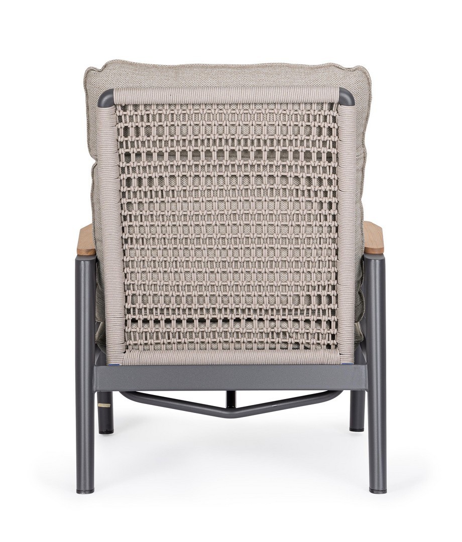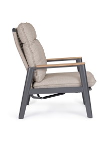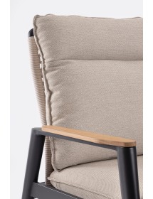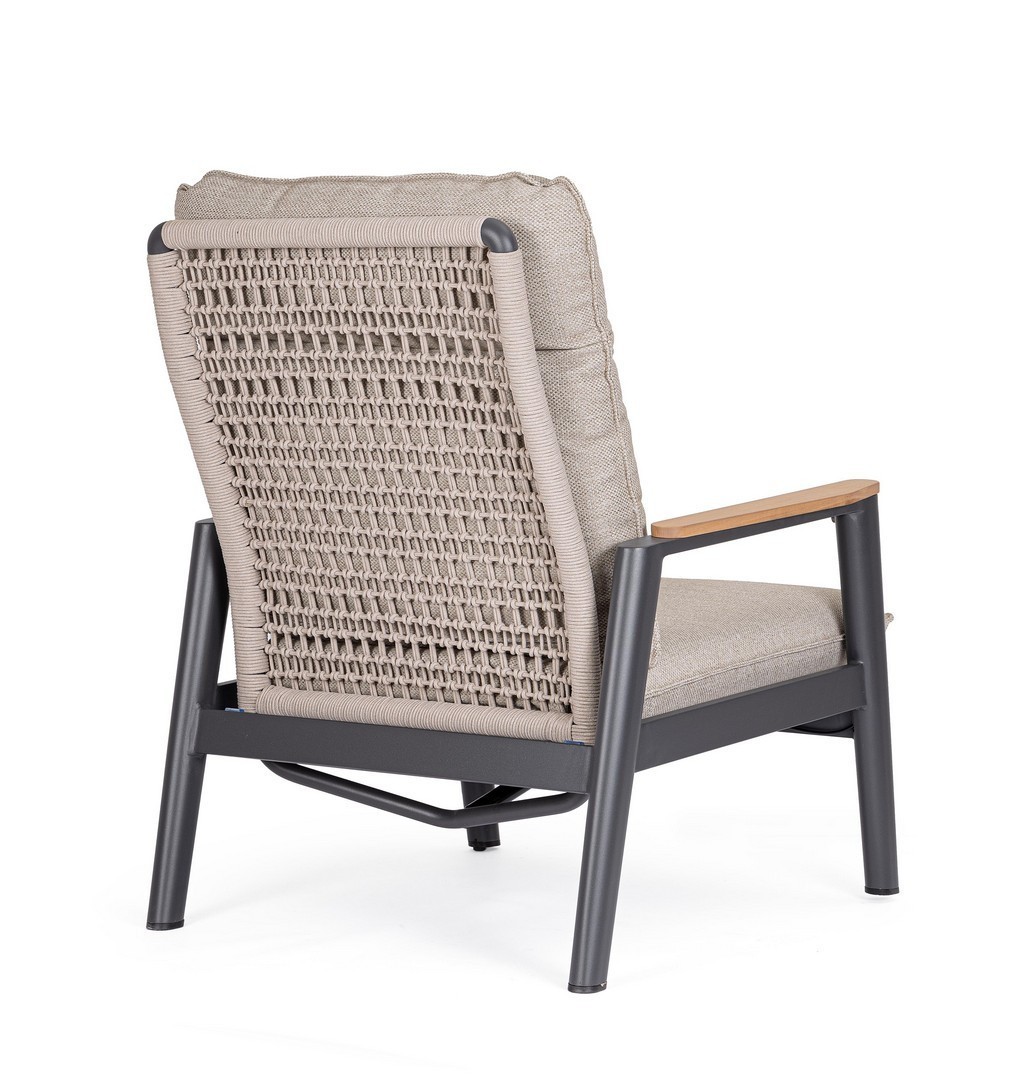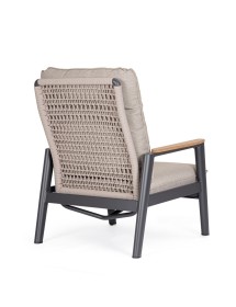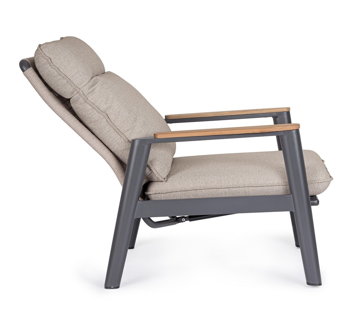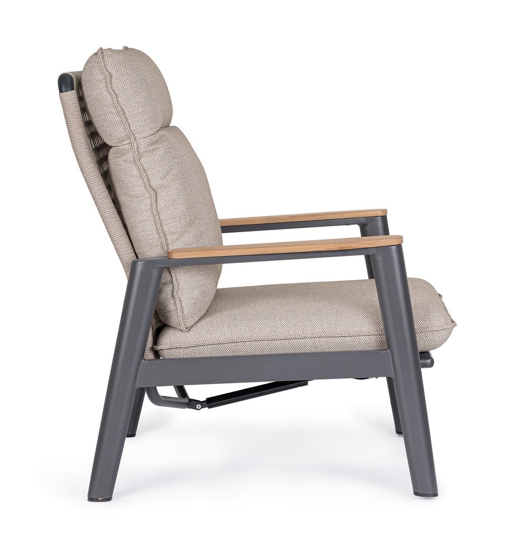STRUTTURA IN ALLUMINIO VERNICIATA A POLVERE (POLIESTERE). BRACCIOLI CON INSERTI IN TEAK. SCHIENALE (CON INTRECCIO IN CORDA OLEFIN),RECLINABILE IN LIBERA POSIZIONE E SEDUTA IN TEXTILENE 1X1. CUSCINI SFODERABILI CON TESSUTO IDROREPELLENTE OLEFIN (100% POLIPROPILENE). VITERIA IN ACCIAIO INOSSIDABILE. SCHIENALE DA INSERIRE. NON VENDIBILE IN GERMANIA, AUSTRIA, SVIZZERA, PAESI BASSI, LUSSEMBURGO.