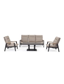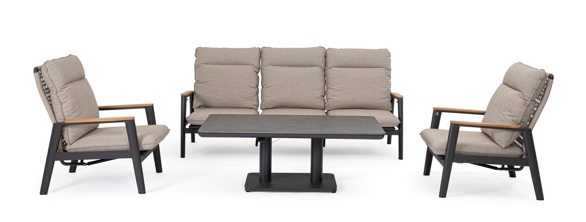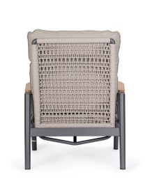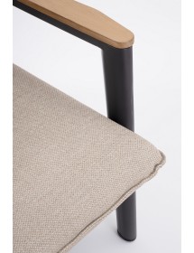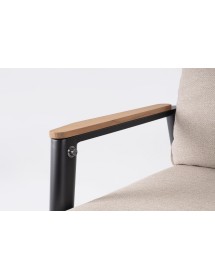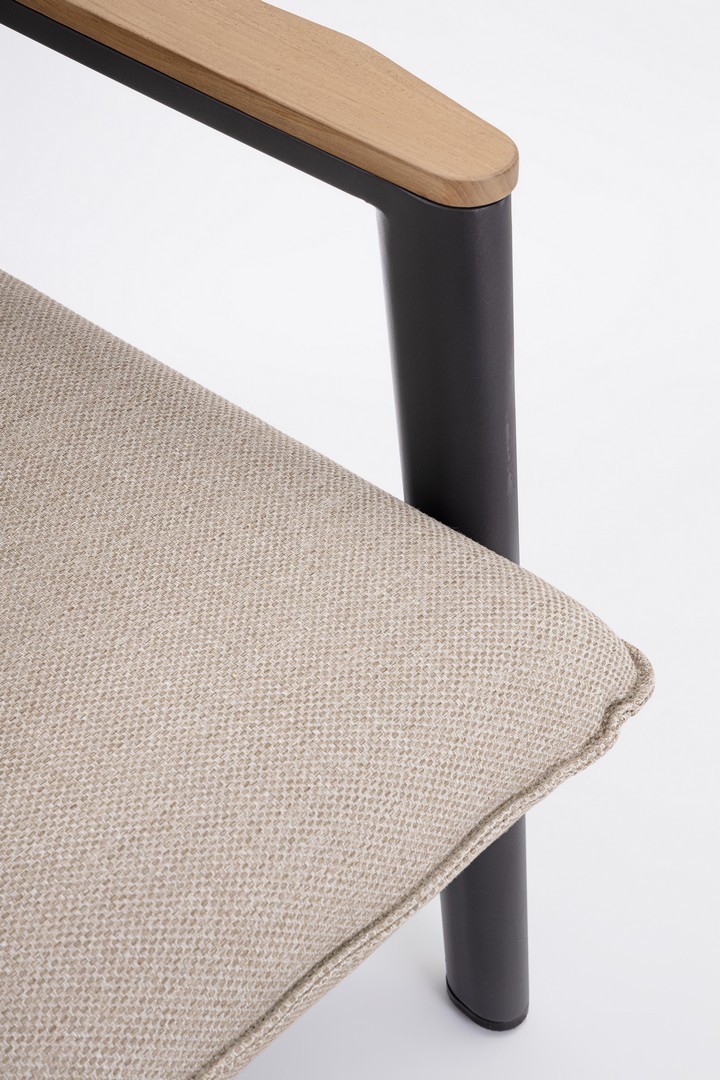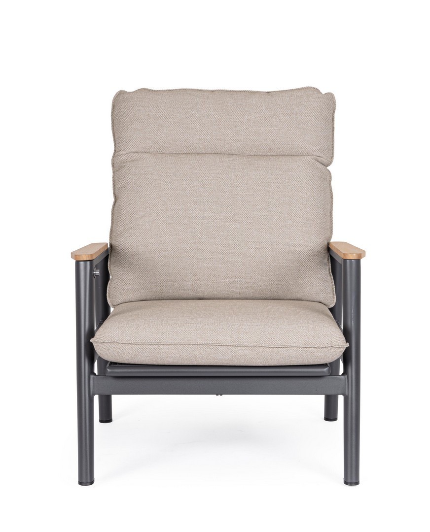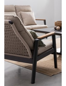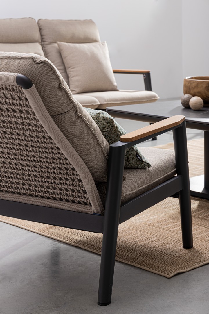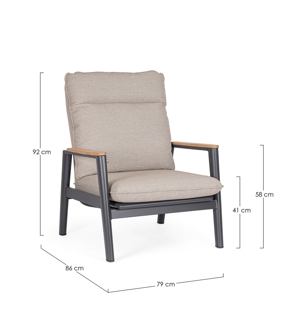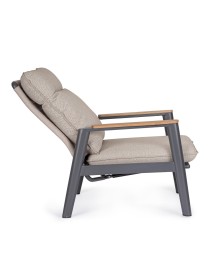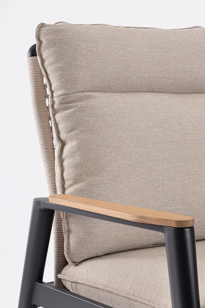 STRUTTURA IN ALLUMINIO VERNICIATA A POLVERE (POLIESTERE). BRACCIOLI CON INSERTI IN TEAK. SCHIENALE (CON INTRECCIO IN CORDA OLEFIN),RECLINABILE IN LIBERA POSIZIONE E SEDUTA IN TEXTILENE 1X1. CUSCINI SFODERABILI CON TESSUTO IDROREPELLENTE OLEFIN (100% POLIPROPILENE). VITERIA IN ACCIAIO INOSSIDABILE. SCHIENALE DA INSERIRE. NON VENDIBILE IN GERMANIA, AUSTRIA, SVIZZERA, PAESI BASSI, LUSSEMBURGO.