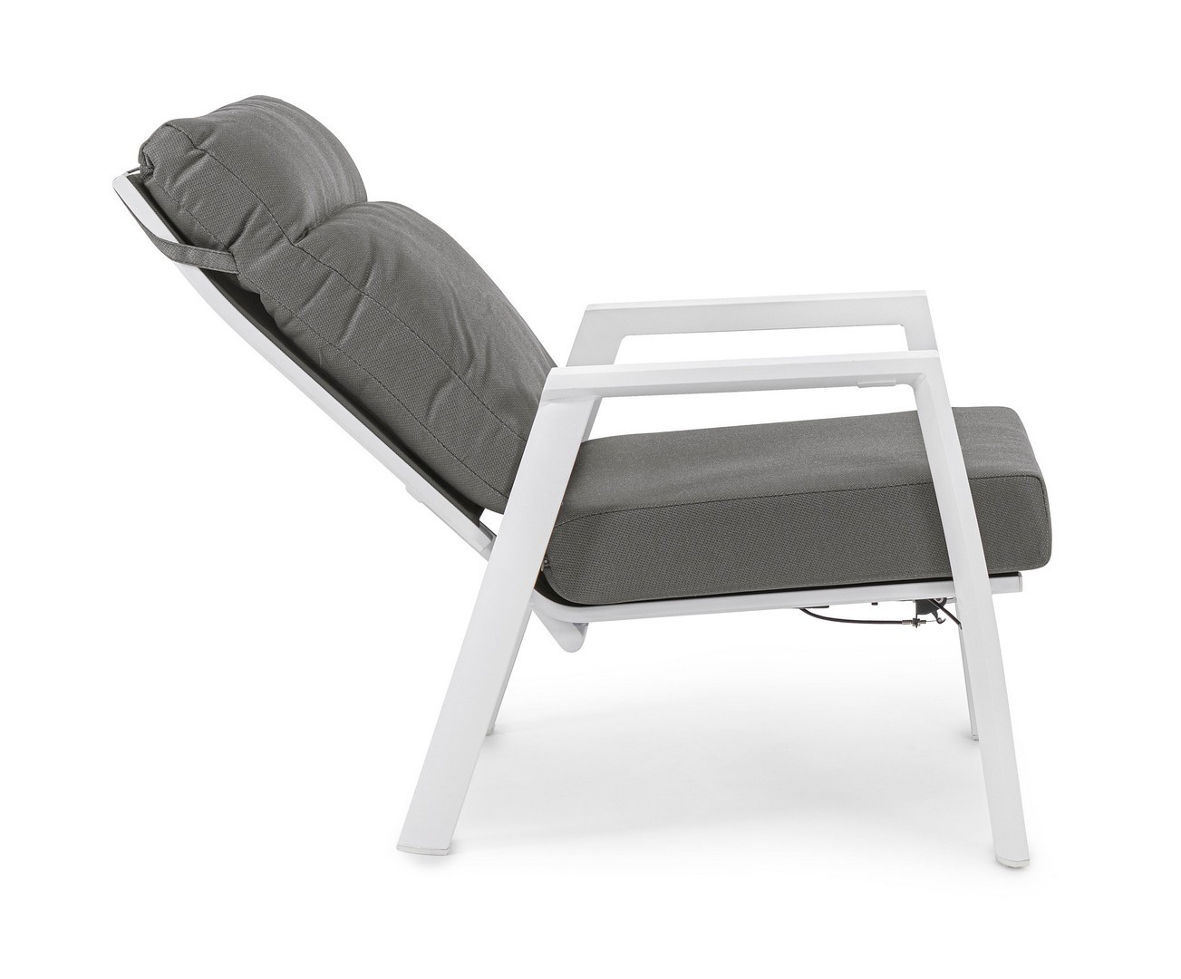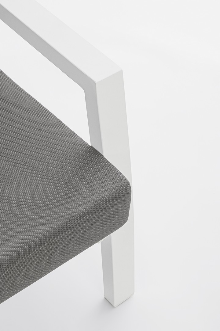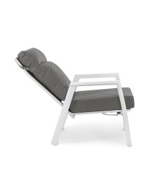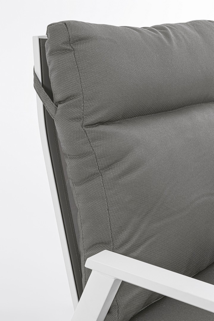 STRUTTURA IN ALLUMINIO VERNICIATA A POLVERE (POLIESTERE). SCHIENALE RECLINABILE IN LIBERA POSIZIONE E SEDUTA IN TEXTILENE 1X1. CUSCINI SFODERABILI CON TESSUTO IDROREPELLENTE OLEFIN (100% POLIPROPILENE). VITERIA IN ACCIAIO INOSSIDABILE.