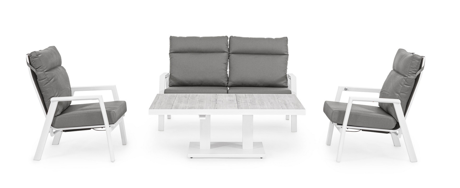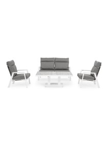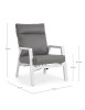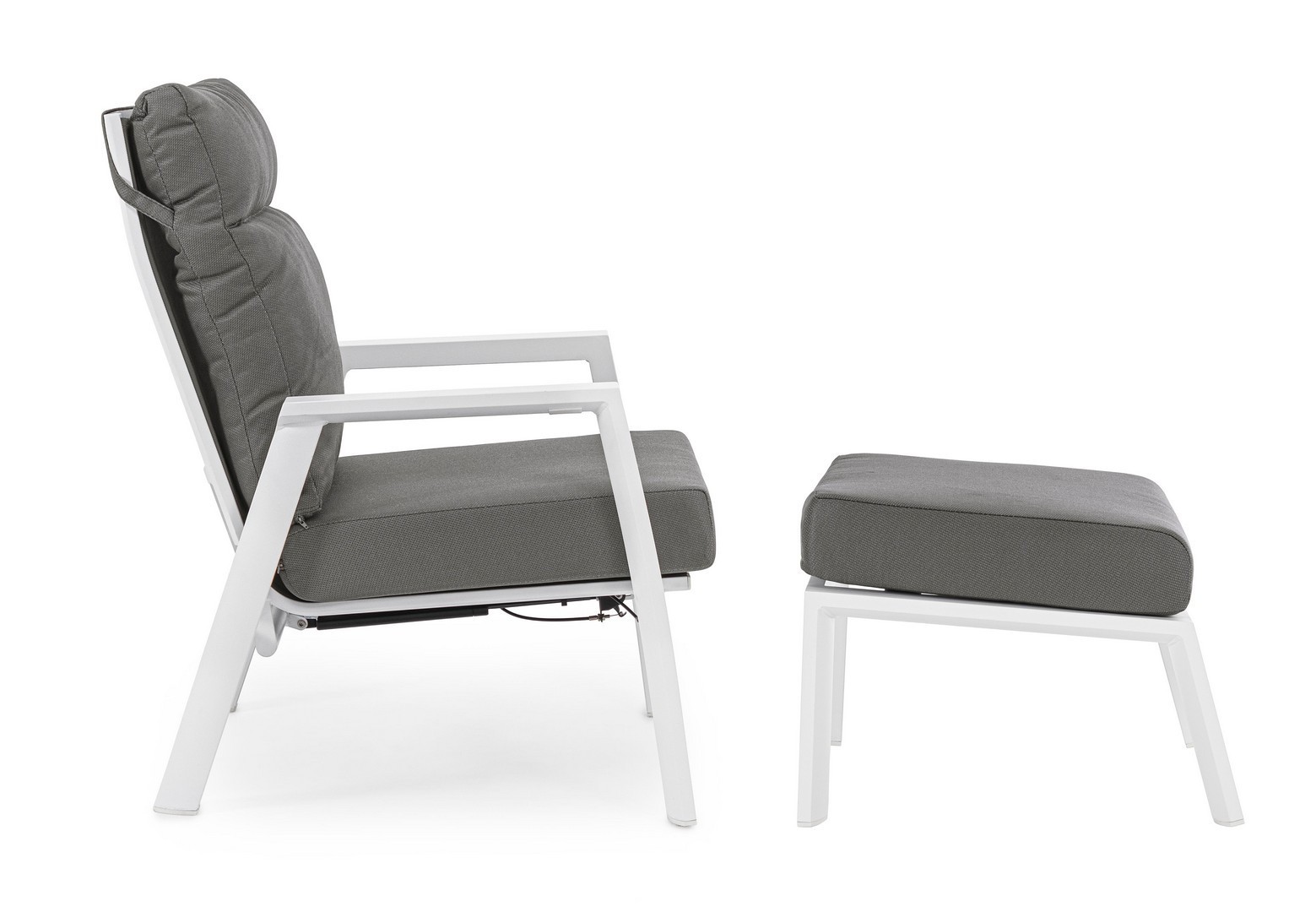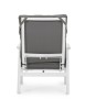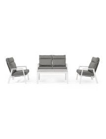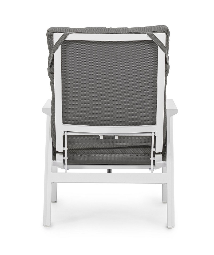 STRUTTURA IN ALLUMINIO VERNICIATA A POLVERE (POLIESTERE). SCHIENALE RECLINABILE IN LIBERA POSIZIONE E SEDUTA IN TEXTILENE 1X1. CUSCINI SFODERABILI CON TESSUTO IDROREPELLENTE OLEFIN (100% POLIPROPILENE). VITERIA IN ACCIAIO INOSSIDABILE.