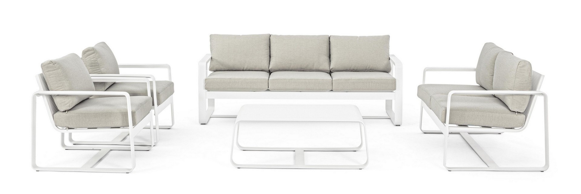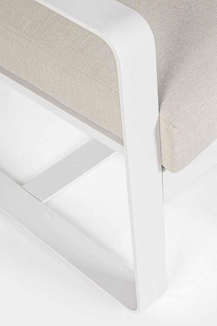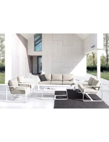 ALLUMINIO VERNICIATO A POLVERE (POLIESTERE). CUSCINI SEDUTA E SCHIENALE SFODERABILI CON TESSUTO IDROREPELLENTE OLEFIN (100% POLIPROPILENE). DA ASSEMBLARE.