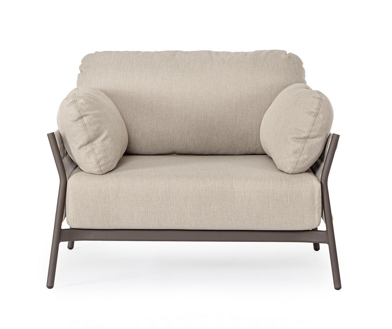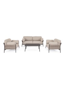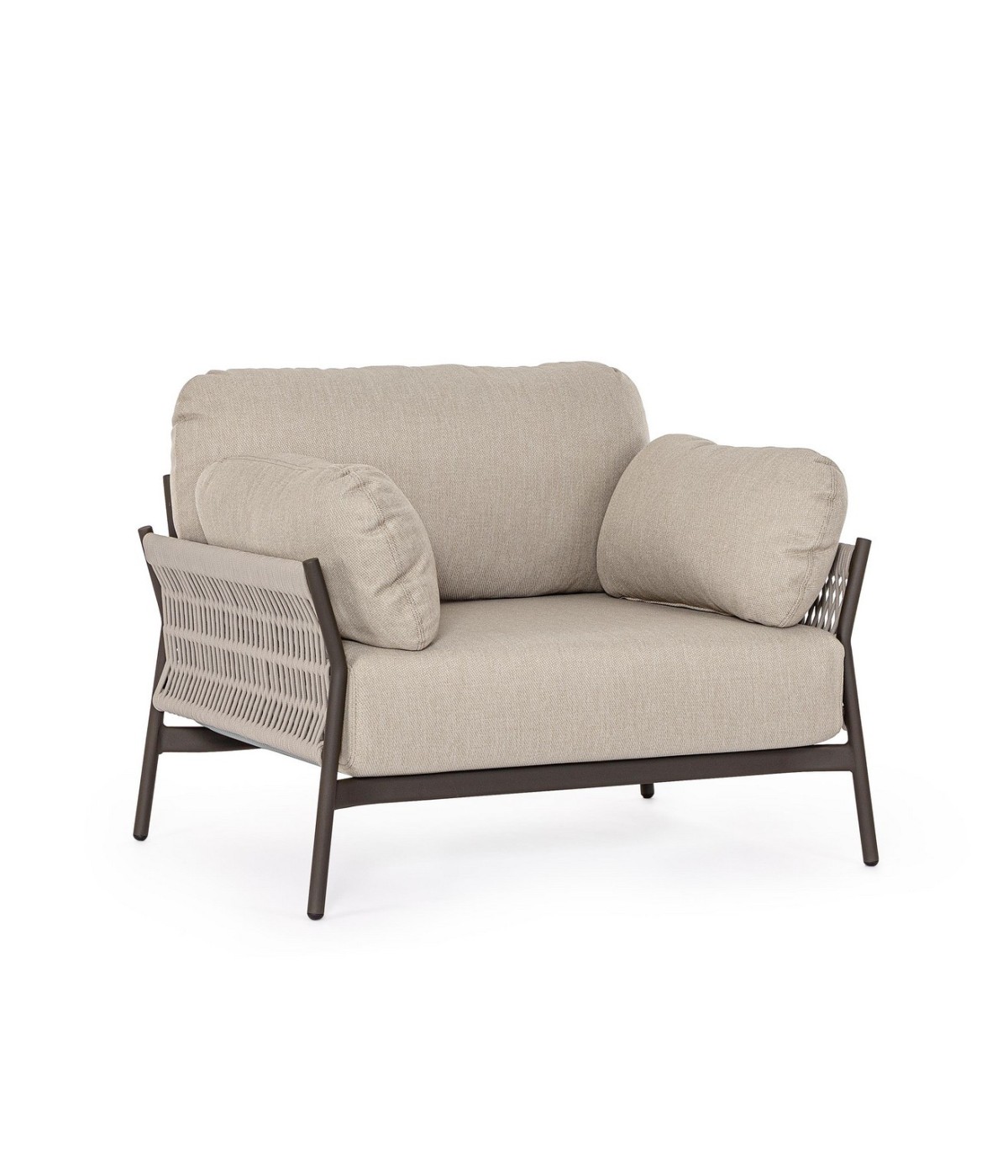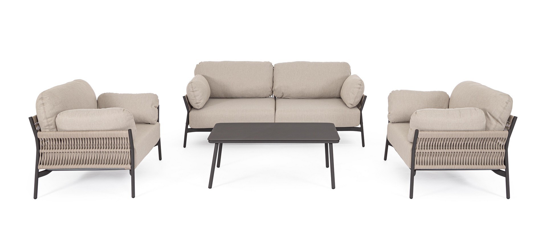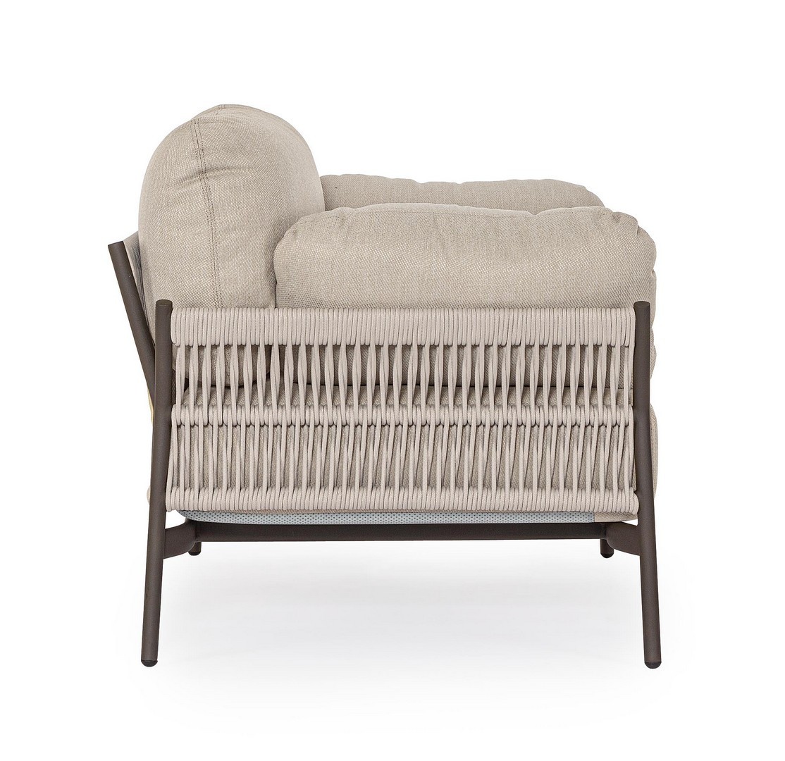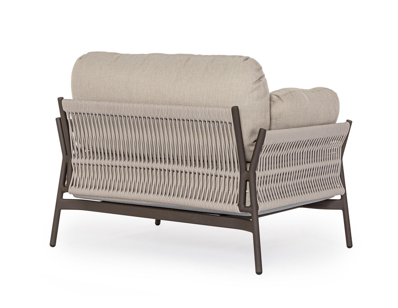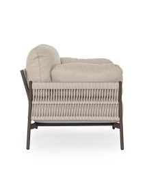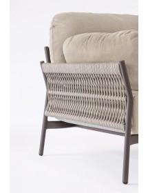 STRUTTURA IN ALLUMINIO VERNICIATO A POLVERE (POLIESTERE). INTRECCIO IN CORDA OLEFIN (100% POLIPROPILENE). CUSCINI SEDUTA E SCHIENALE SFODERABILI IN TESSUTO IDROREPELLENTE OLEFIN (100% POLIPROPILENE).