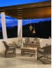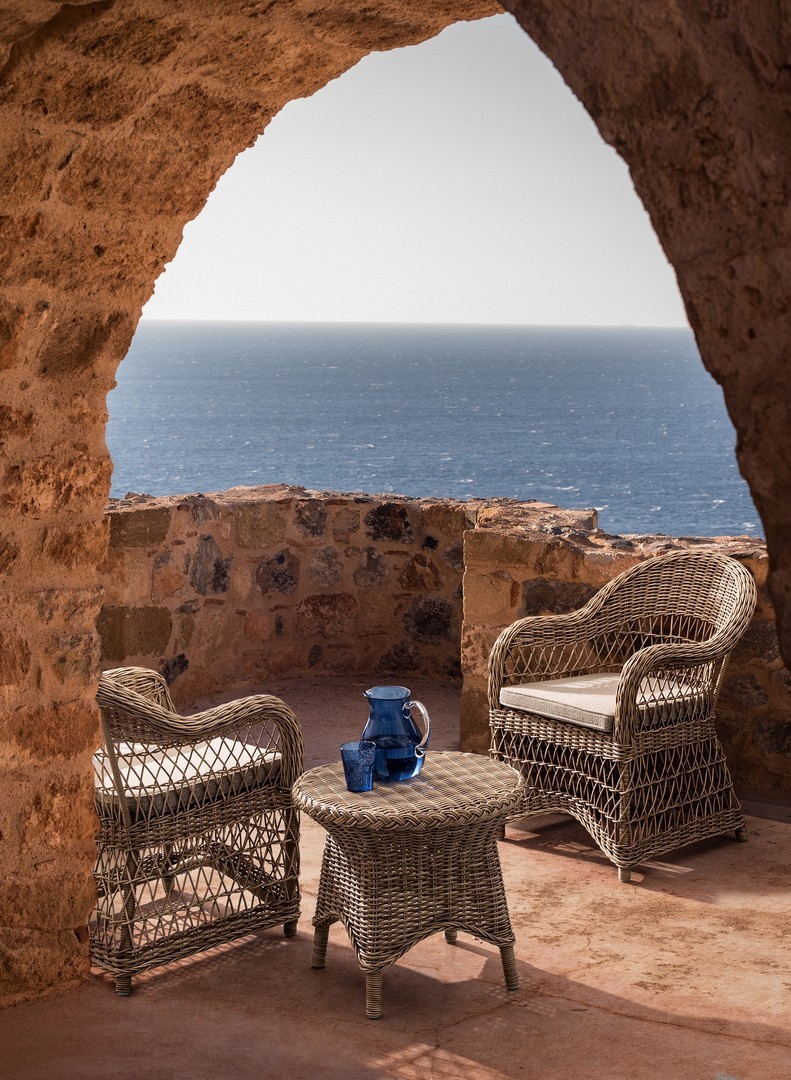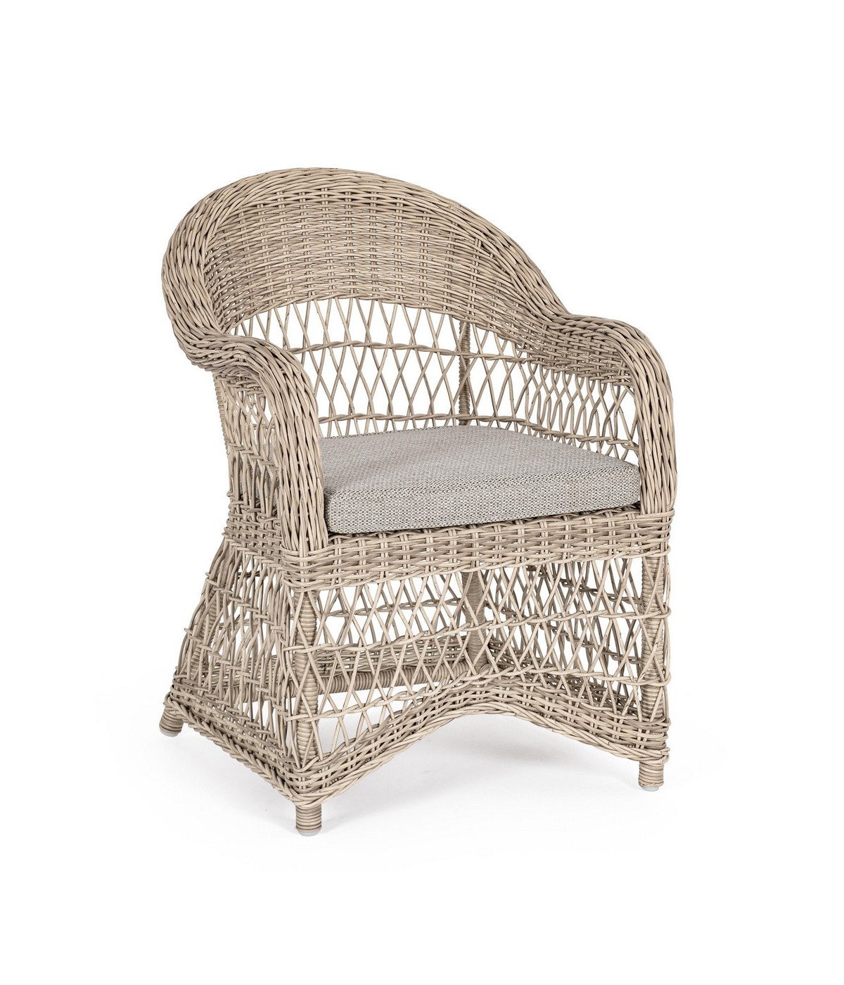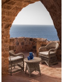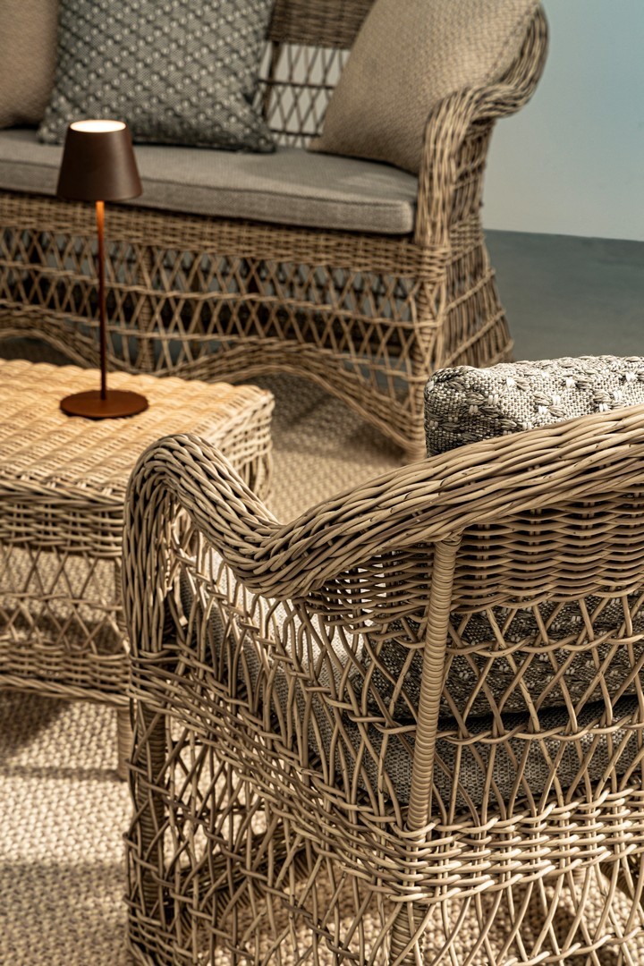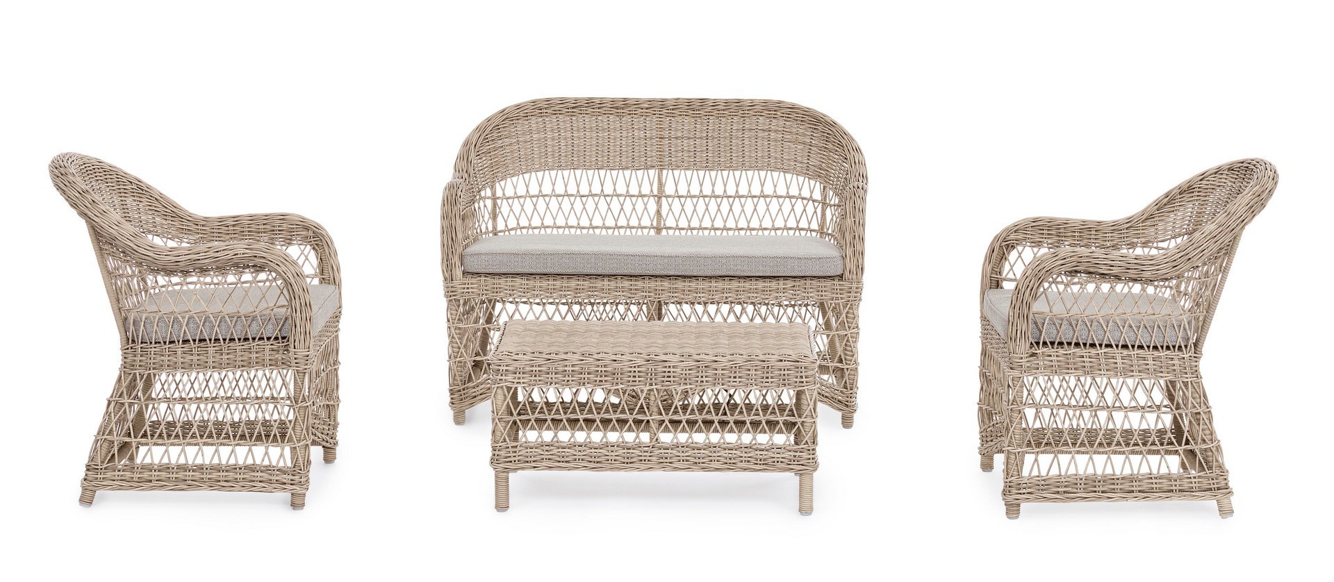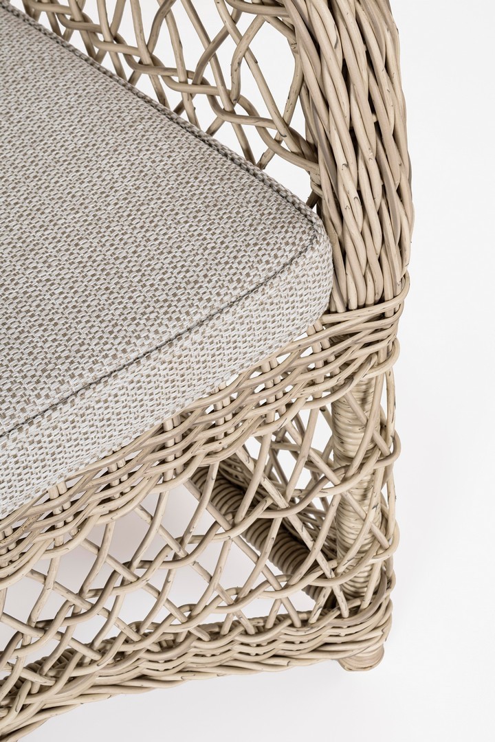 STRUTTURA IN ALLUMINIO VERNICIATO A POLVERE (POLIESTERE), INTRECCIO IN FIBRA SINTETICA (TONDO 5, 3MM).CUSCINI SFODERABILI CON TESSUTO IDROREPELLENTE SUNPROOF OLEFIN (100%POLYPROPYLENE). IMBALLO SENZA CARTONE.