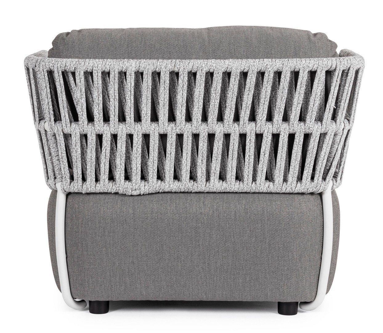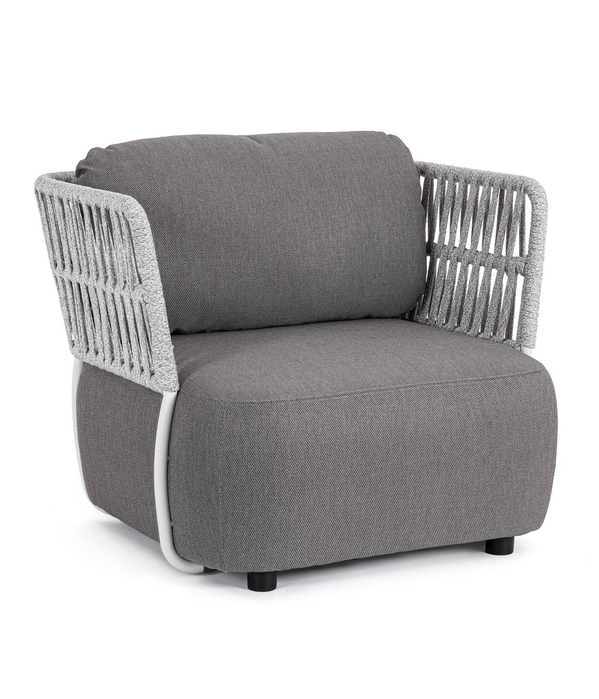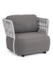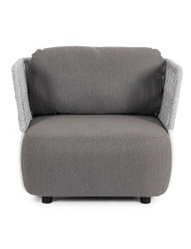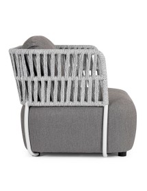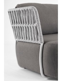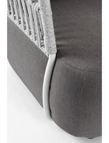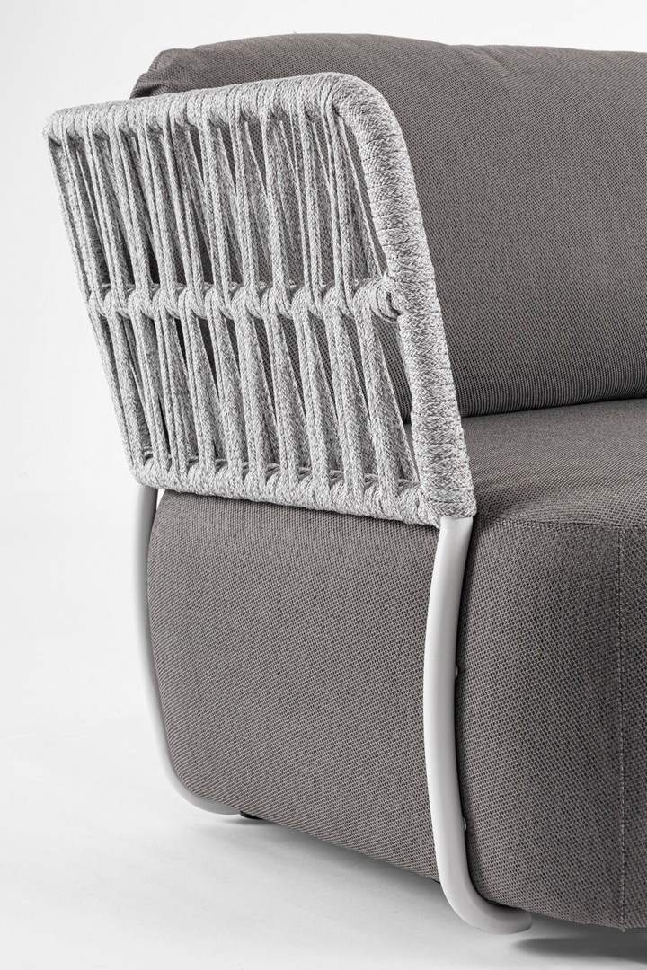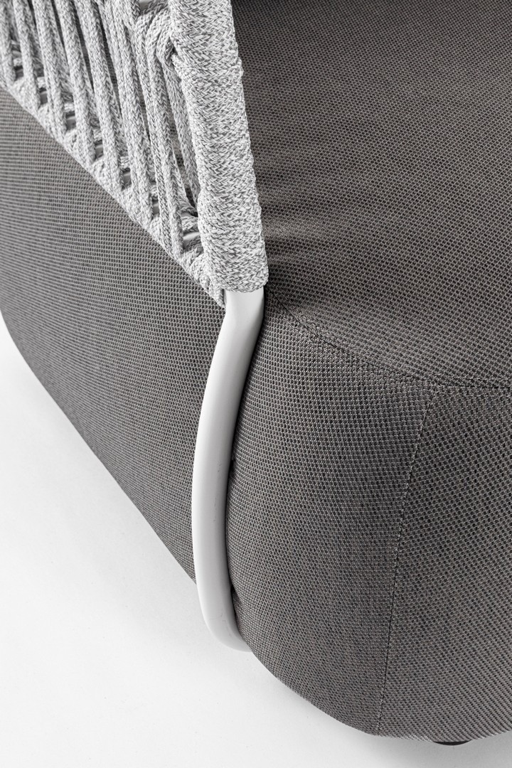 STRUTTURA IN ALLUMINIO VERNICIATO A POLVERE (POLIESTERE). INTRECCIO IN CORDA OLEFIN (100% POLIPROPILENE). SEDUTA CON IMBOTTITURA IMPERMEABILE, RIVESTIMENTO NON SFODERABILE IN TESSUTO PER ESTERNO IN OLEFIN (100% POLIPROPILENE, 285G/M2),IDROREPELLENTE E RESISTENTE AI RAGGI UV (GRADO 7). CUSCINO SCHIENALE SFODERABILE IN TESSUTO OLEFIN.