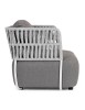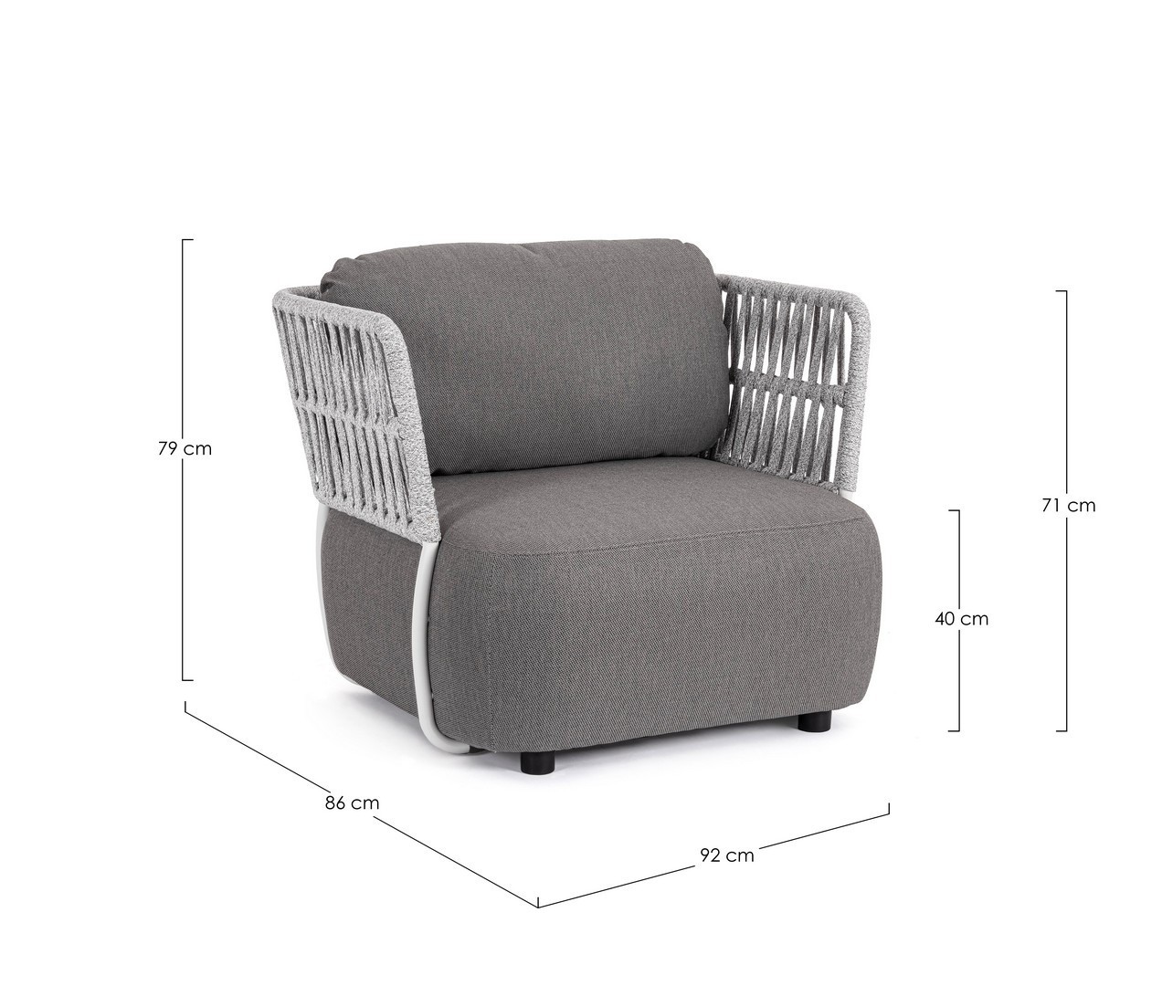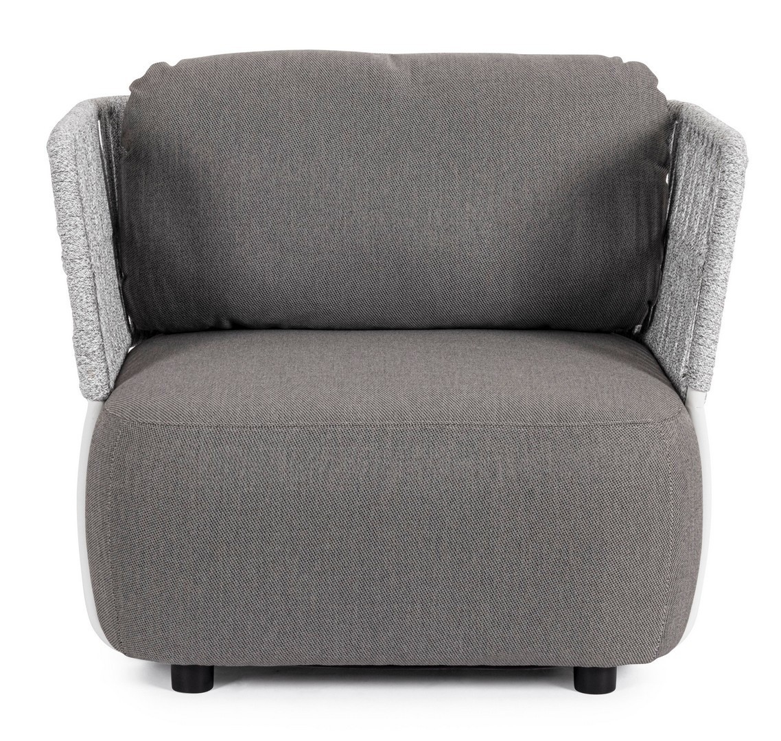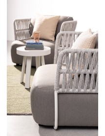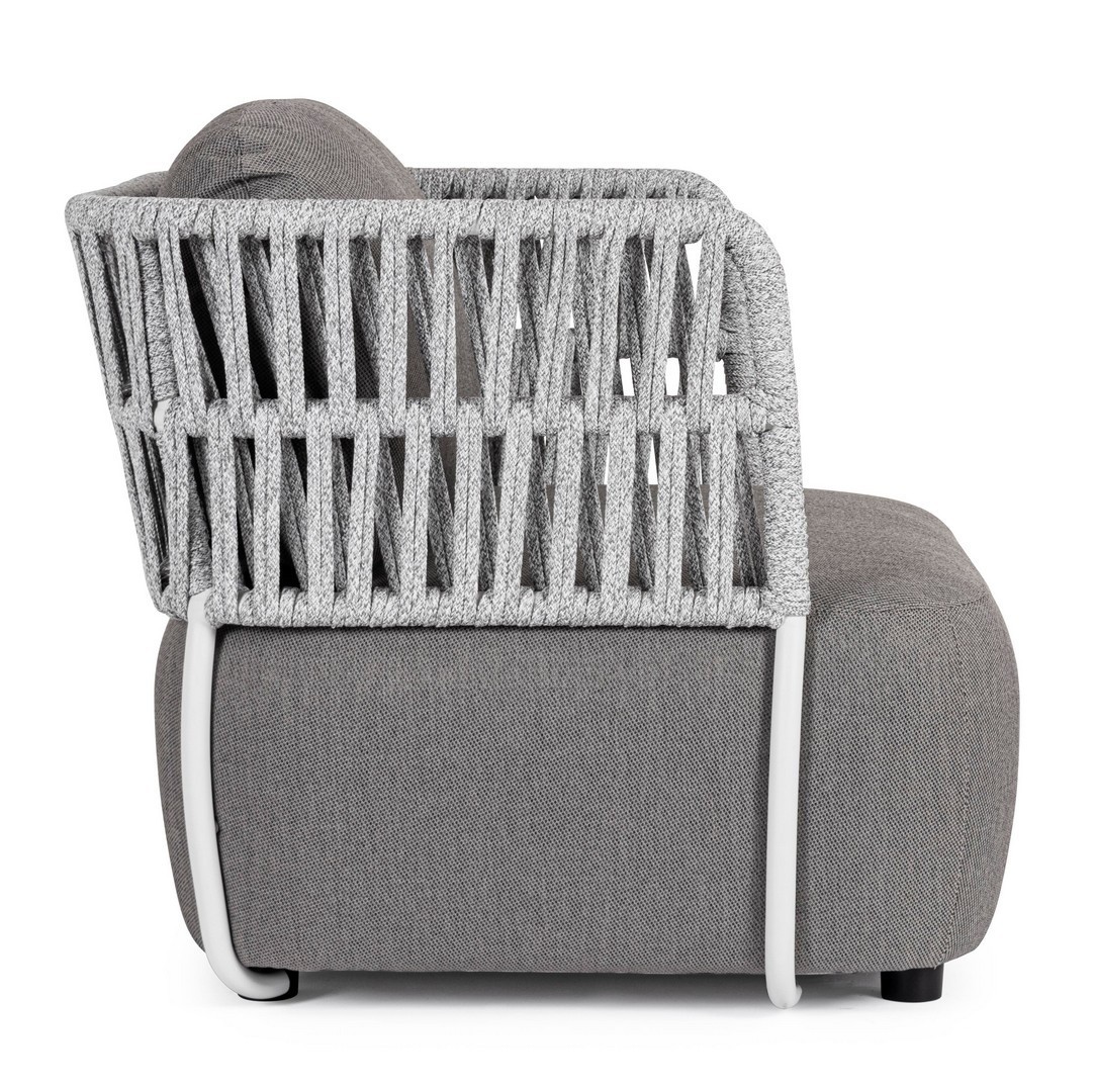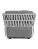 STRUTTURA IN ALLUMINIO VERNICIATO A POLVERE (POLIESTERE). INTRECCIO IN CORDA OLEFIN (100% POLIPROPILENE). SEDUTA CON IMBOTTITURA IMPERMEABILE, RIVESTIMENTO NON SFODERABILE IN TESSUTO PER ESTERNO IN OLEFIN (100% POLIPROPILENE, 285G/M2),IDROREPELLENTE E RESISTENTE AI RAGGI UV (GRADO 7). CUSCINO SCHIENALE SFODERABILE IN TESSUTO OLEFIN.