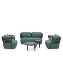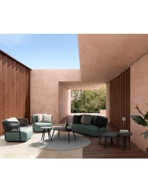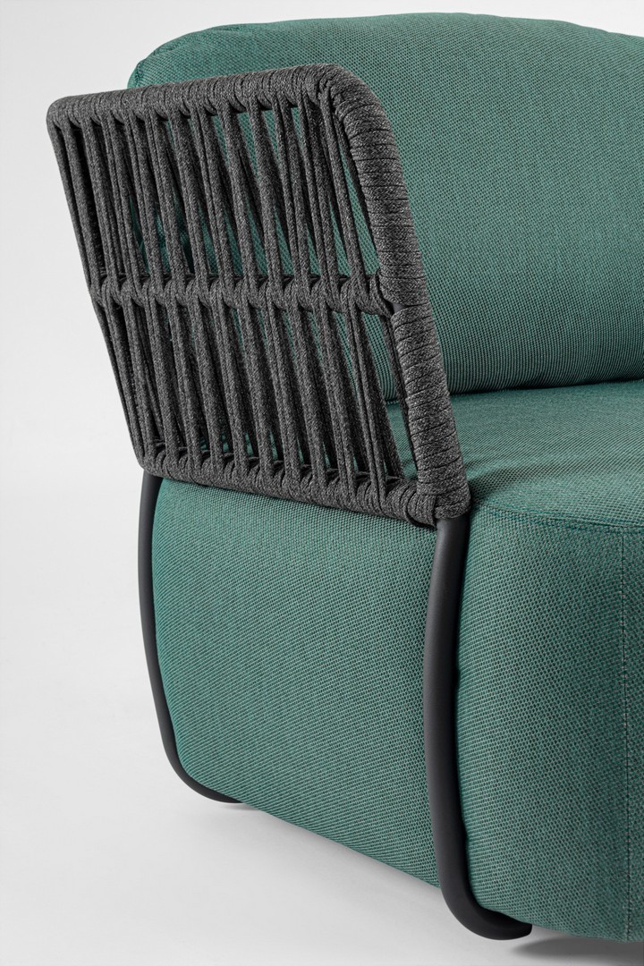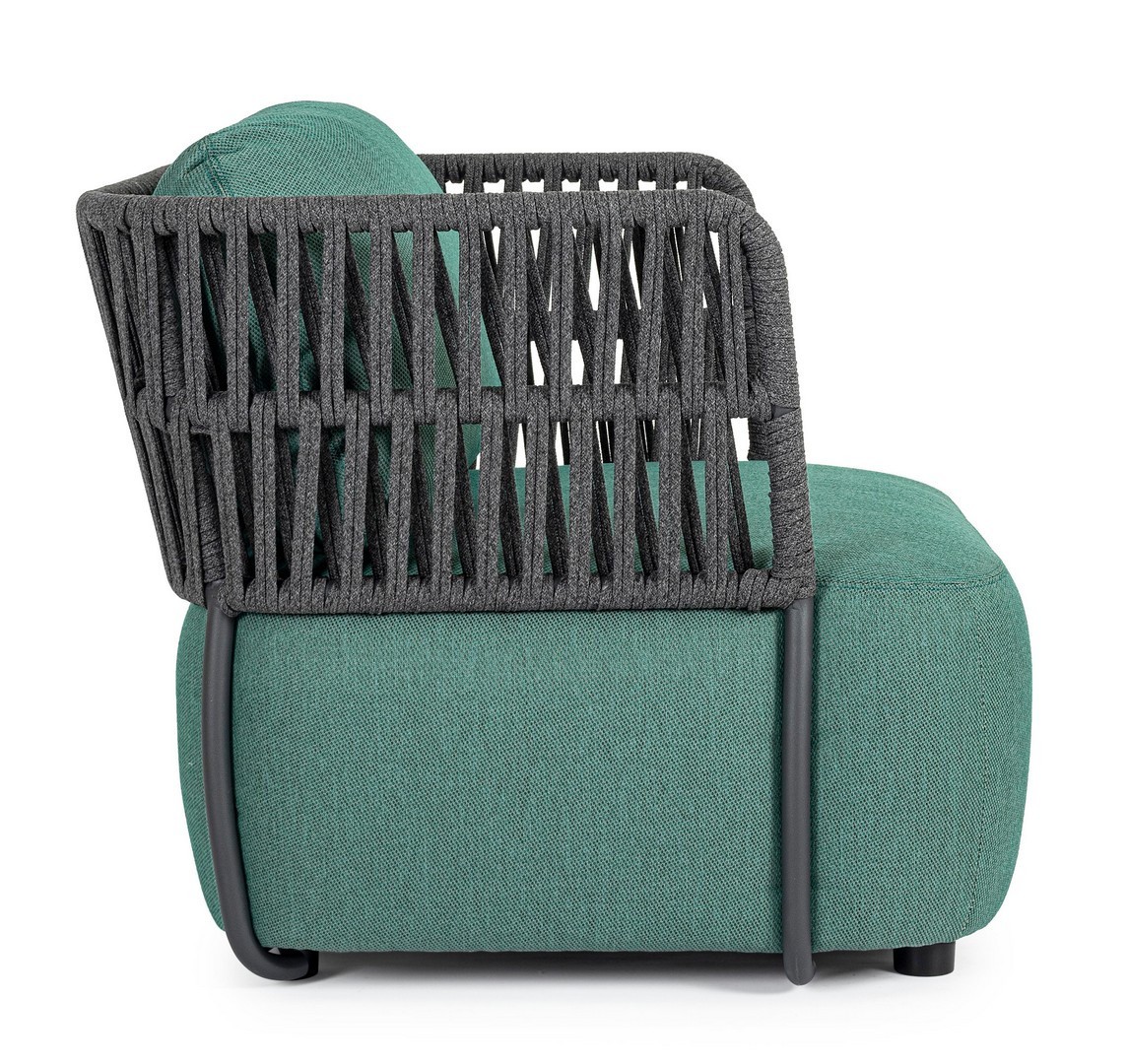 STRUTTURA IN ALLUMINIO VERNICIATO A POLVERE (POLIESTERE). INTRECCIO IN CORDA OLEFIN (100% POLIPROPILENE). SEDUTA CON IMBOTTITURA IMPERMEABILE, RIVESTIMENTO NON SFODERABILE IN TESSUTO PER ESTERNO IN OLEFIN (100% POLIPROPILENE, 285G/M2),IDROREPELLENTE E RESISTENTE AI RAGGI UV (GRADO 7). CUSCINO SCHIENALE SFODERABILE IN TESSUTO OLEFIN.