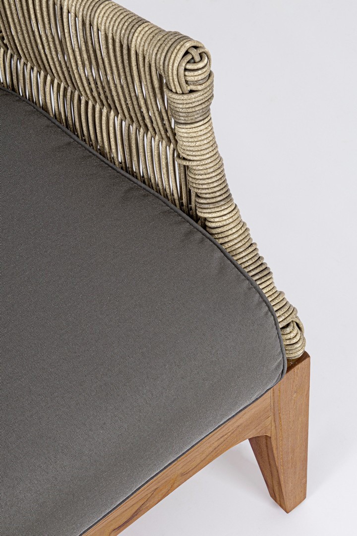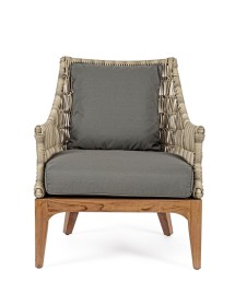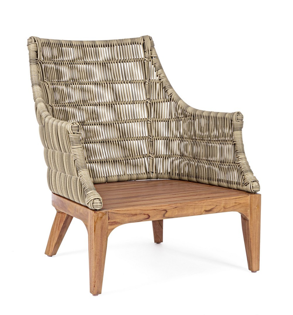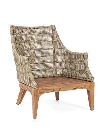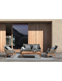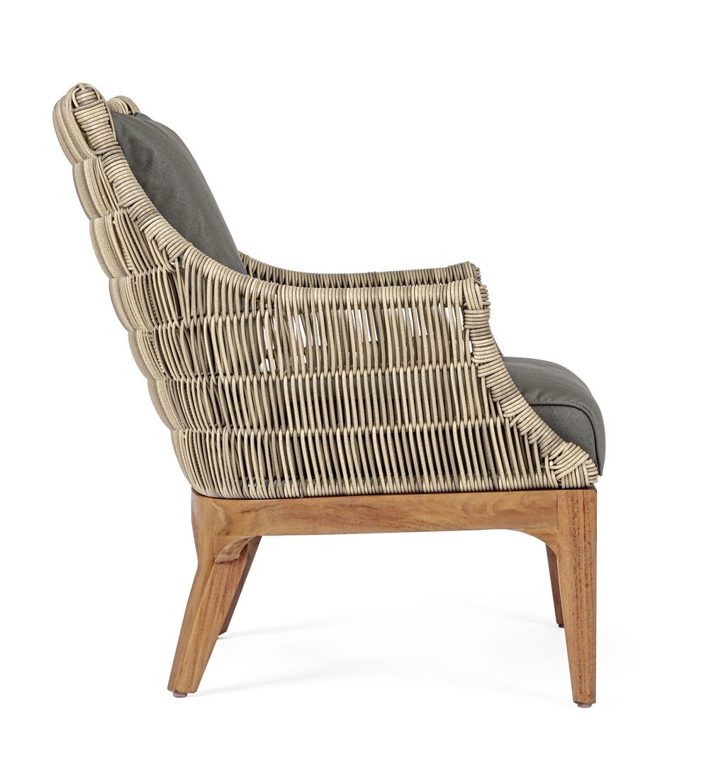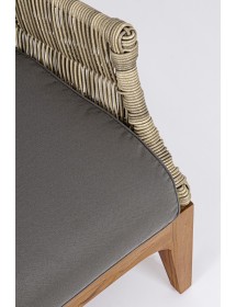 STRUTTURA SCHIENALE IN ALLUMINIO VERNICIATO A POLVERE (POLIESTERE). SEDUTA E GAMBE IN TEAK - SVLK (LEGNO CERTIFICATO PROVENIENTE DA FORESTE SOSTENIBILI). INTRECCIO PER ESTERNO IN FIBRA SINTETICA TONDA 5MM. CUSCINI SFODERABILI CON TESSUTO SUNPROOF OLEFIN (100% POLIPROPILENE). IMBOTTITURA PER ESTERNO QUICK DRY FOAM (ANTIUMIDITA').