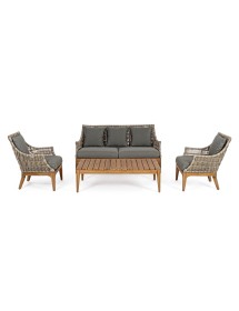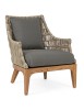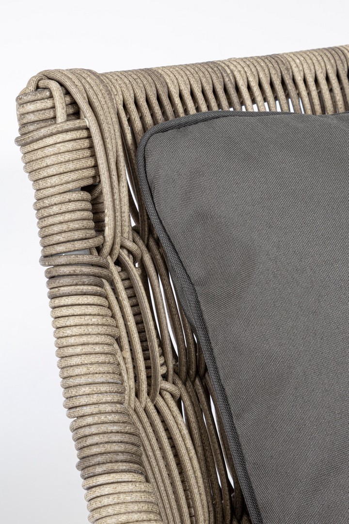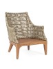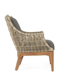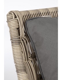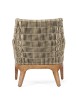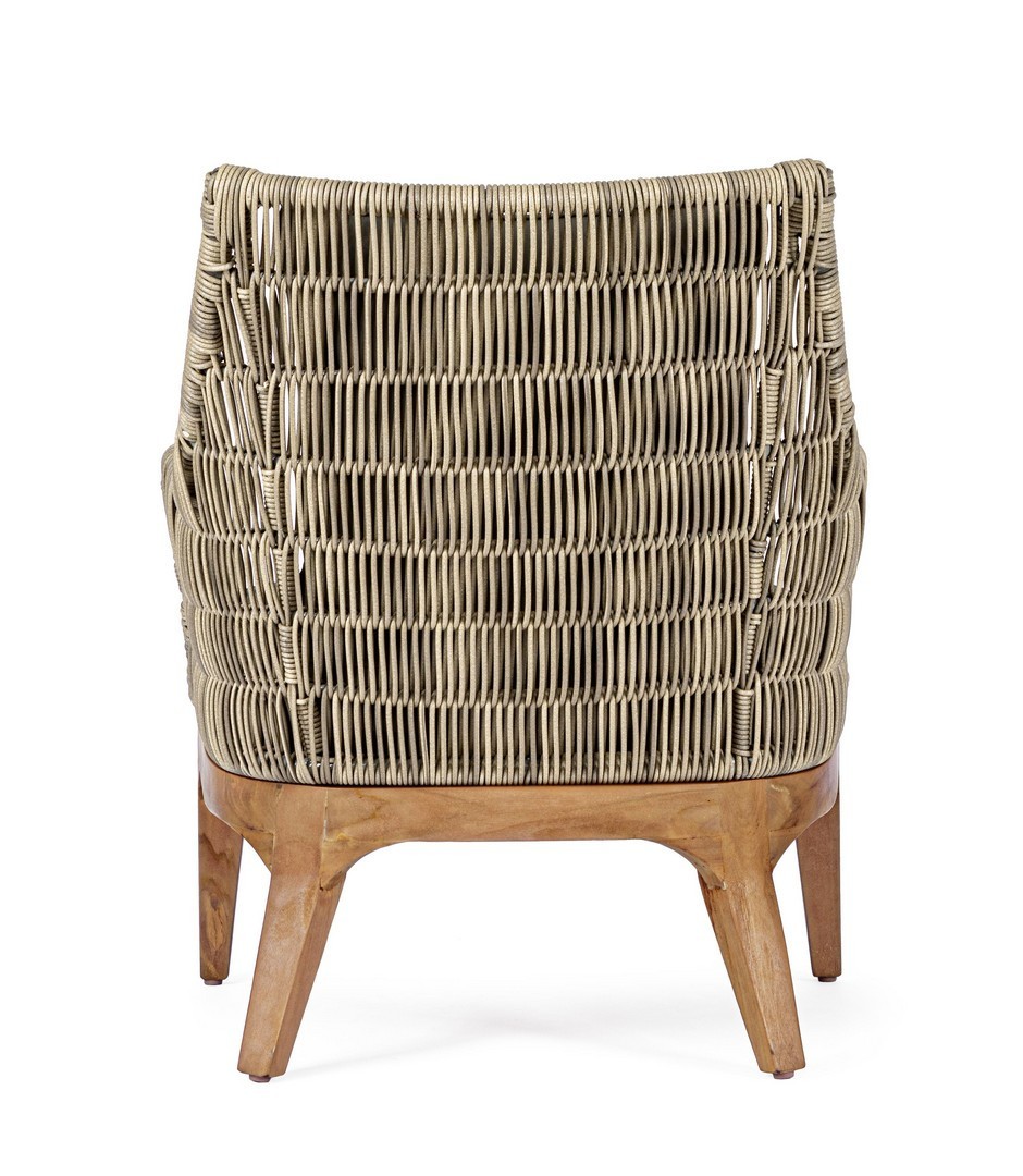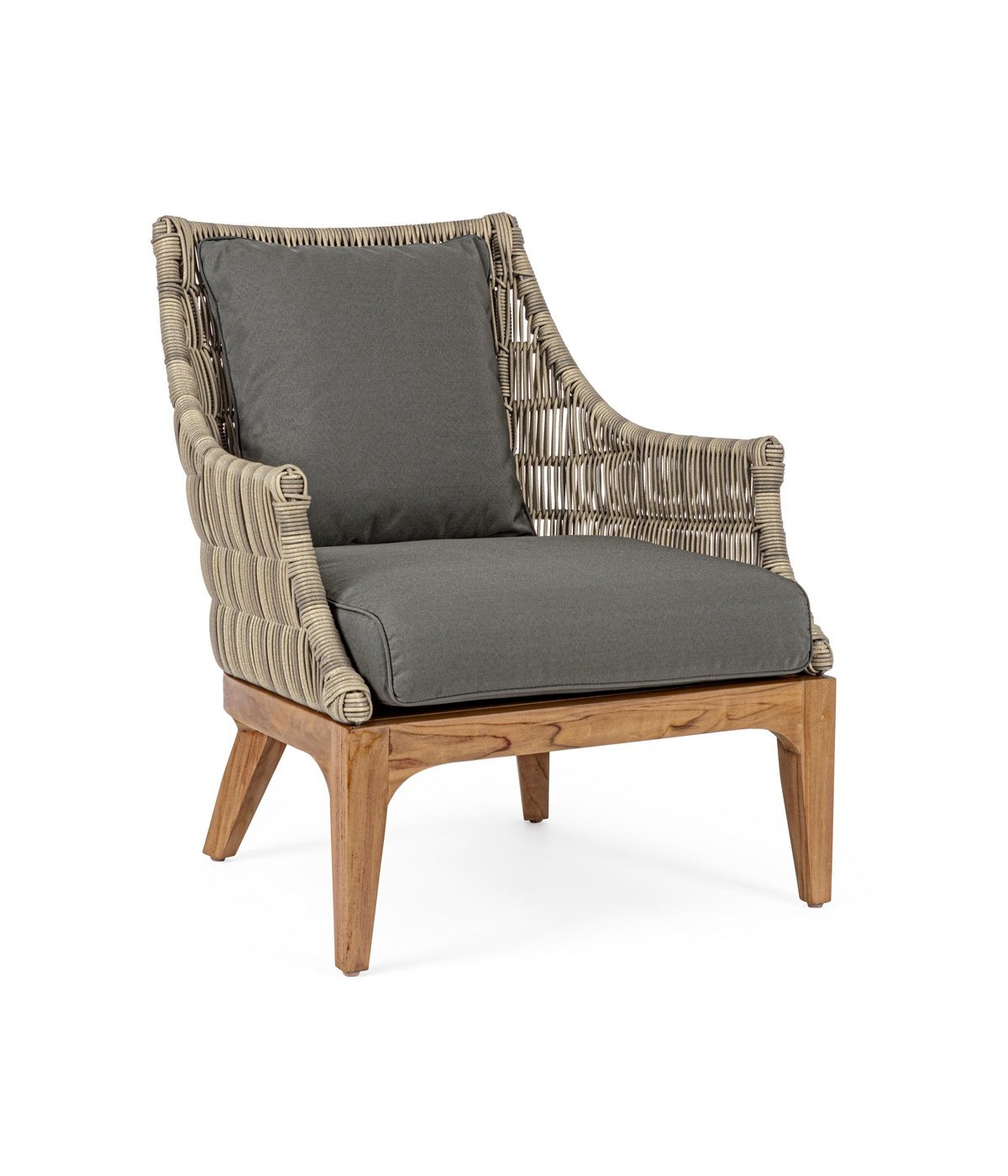 STRUTTURA SCHIENALE IN ALLUMINIO VERNICIATO A POLVERE (POLIESTERE). SEDUTA E GAMBE IN TEAK - SVLK (LEGNO CERTIFICATO PROVENIENTE DA FORESTE SOSTENIBILI). INTRECCIO PER ESTERNO IN FIBRA SINTETICA TONDA 5MM. CUSCINI SFODERABILI CON TESSUTO SUNPROOF OLEFIN (100% POLIPROPILENE). IMBOTTITURA PER ESTERNO QUICK DRY FOAM (ANTIUMIDITA').