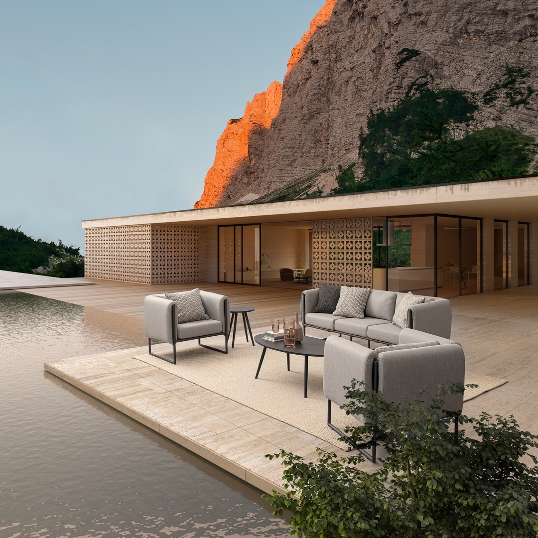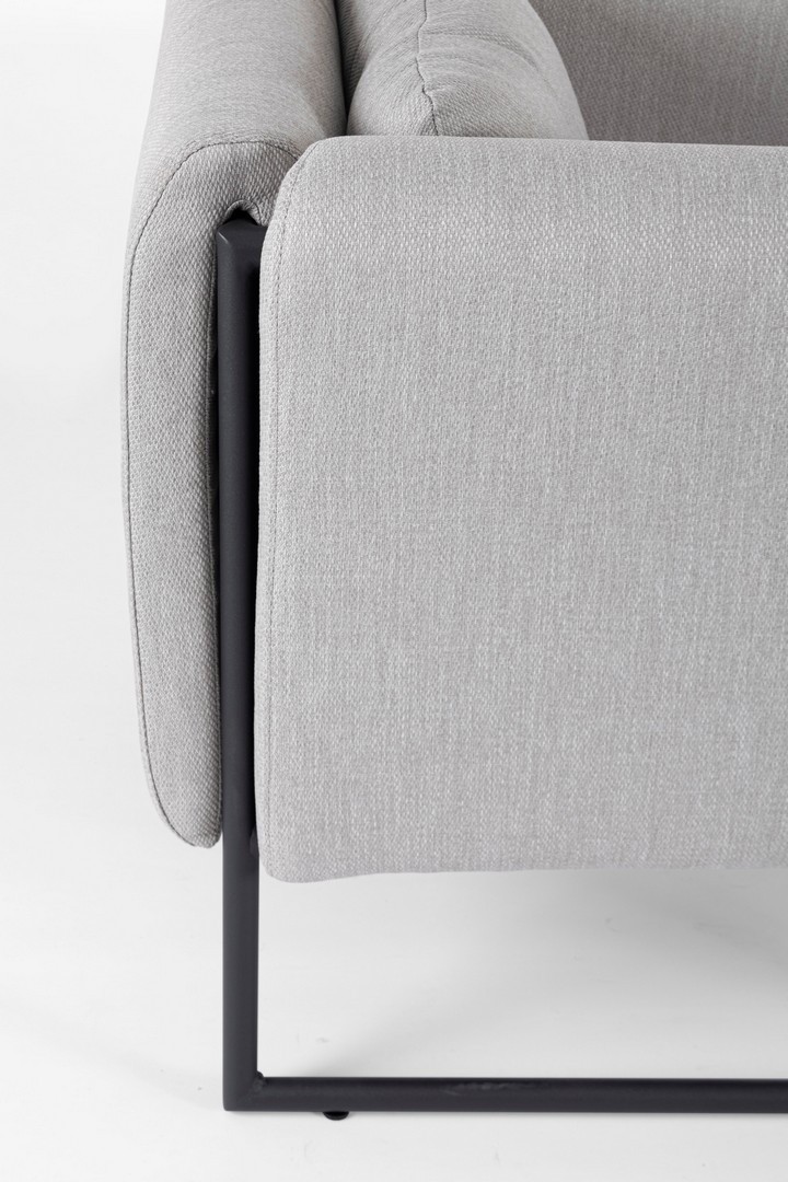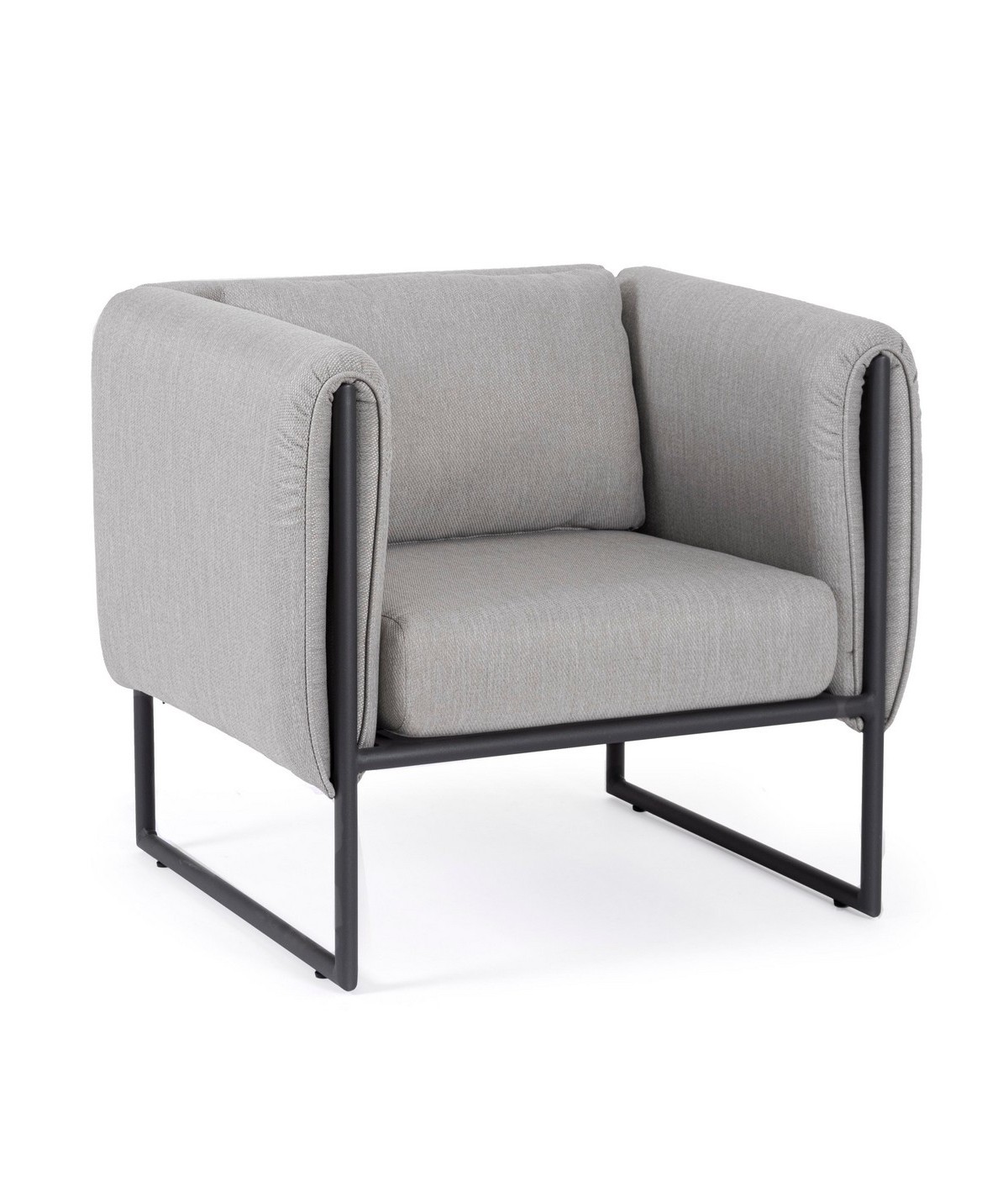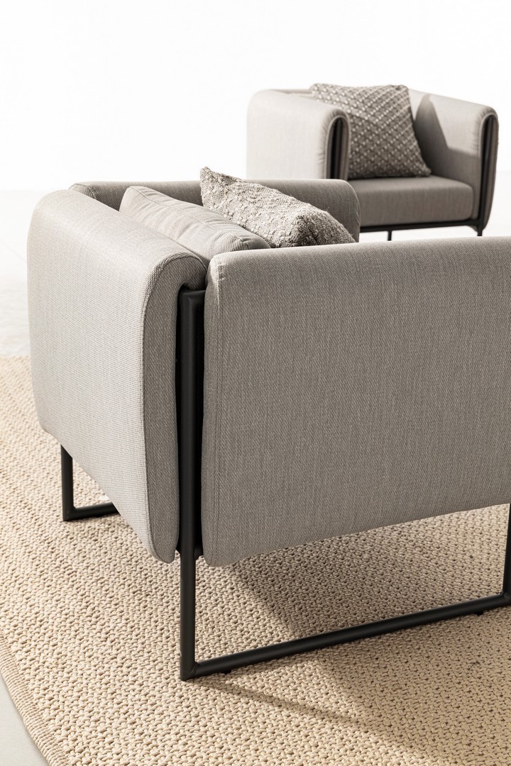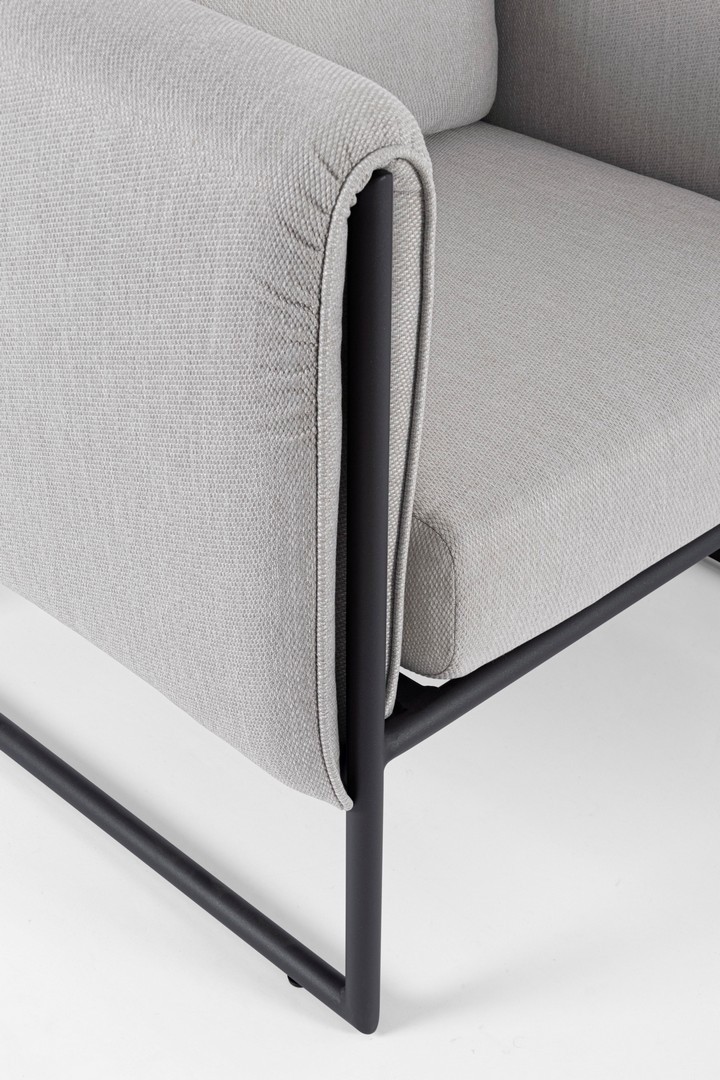 STRUTTURA IN ALLUMINIO VERNICIATO A POLVERE (POLIESTERE). SEDUTA COMPLETA CON IMBOTTITURA IMPERMEABILE, RIVESTIMENTO NON SFODERABILE IN TESSUTO PER ESTERNO IN OLEFIN (100% POLIPROPILENE, 285G/M2),IDROREPELLENTE E RESISTENTE AI RAGGI UV (GRADO 7). CUSCINETTO SCHIENALE SFODERABILE IN TESSUTO OLEFIN.