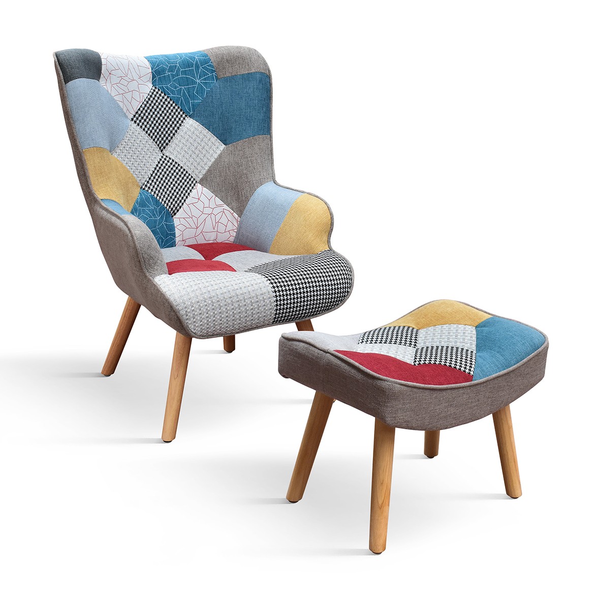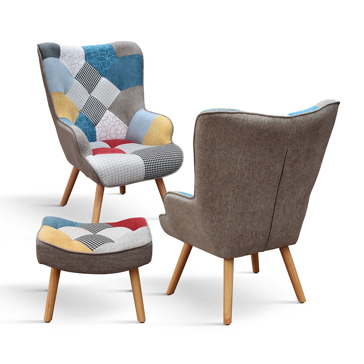 Poltrona moderna Patchwork con pouf imbottita 67x76x97