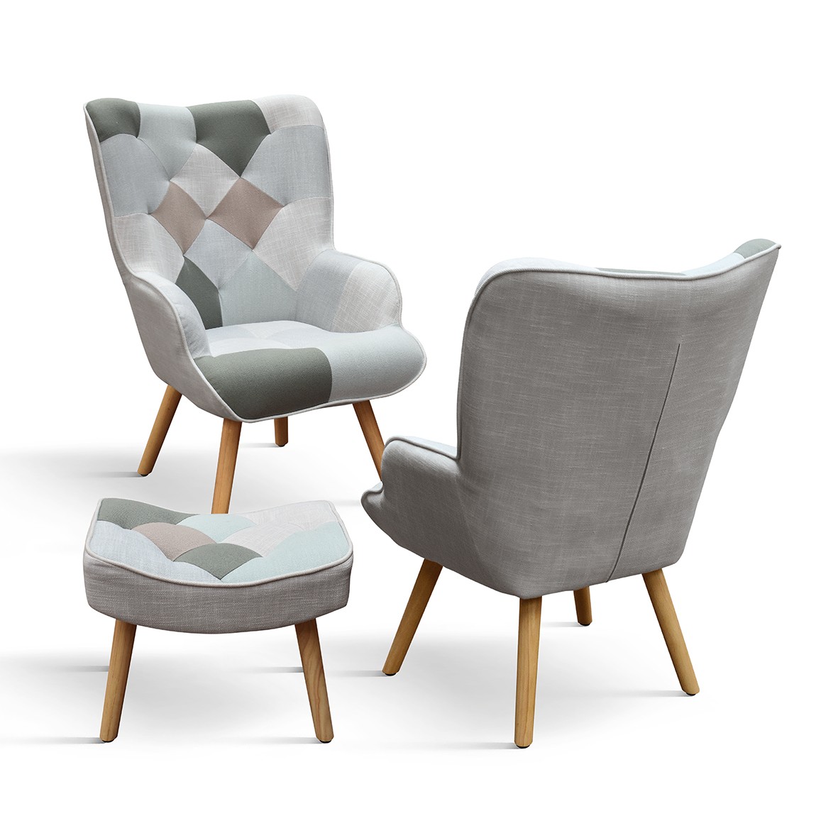 Poltrona moderna Patchwork con pouf imbottita 67x76x97