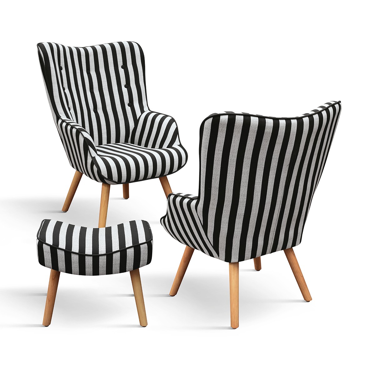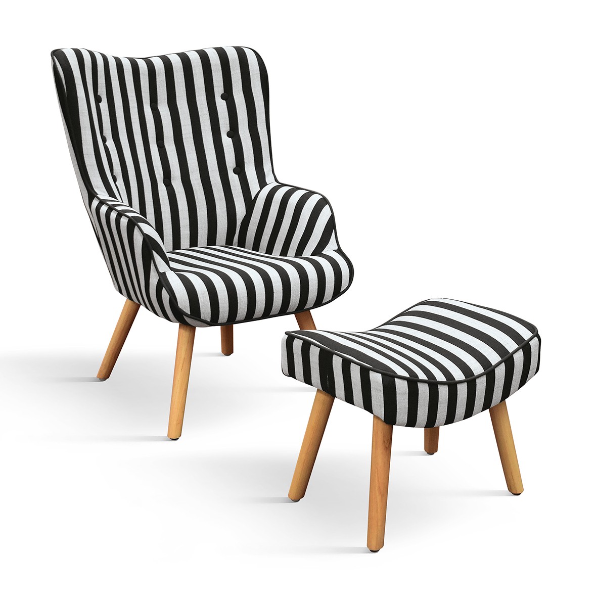 Poltrona moderna righe bianche e nere con pouf imbottito 67x76x97