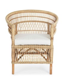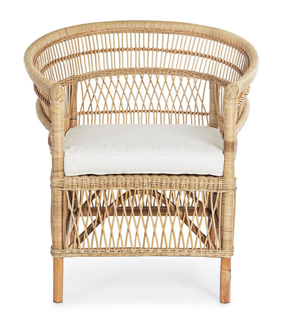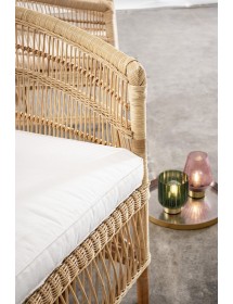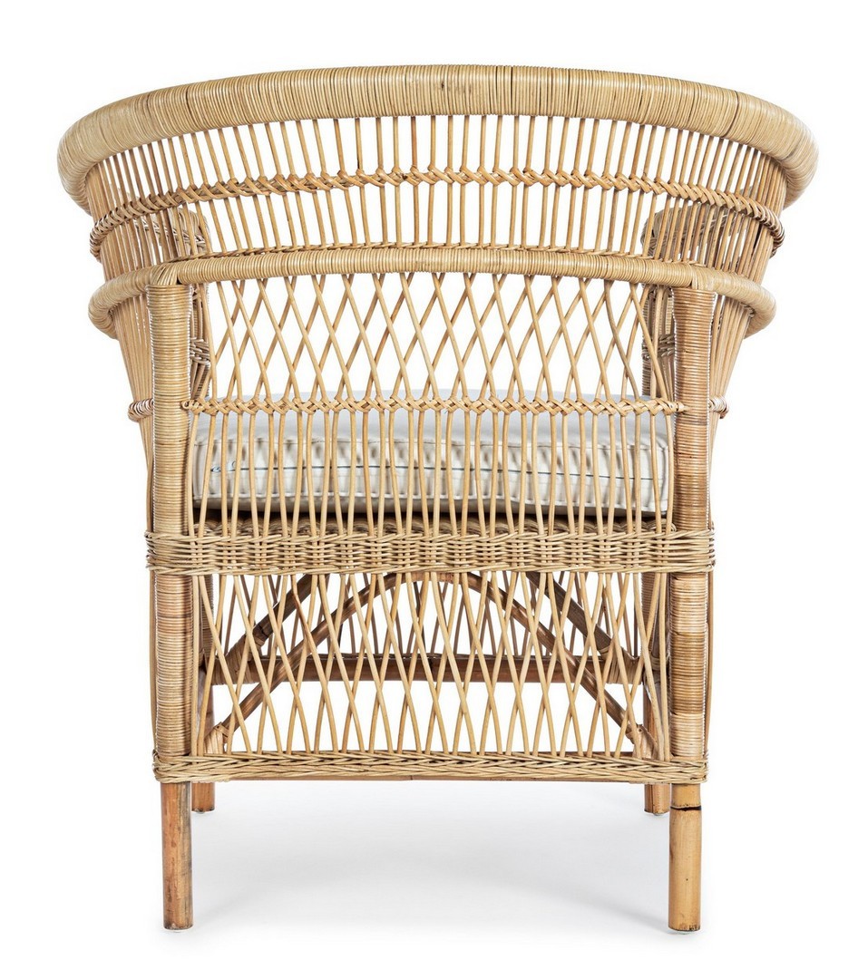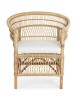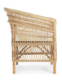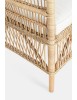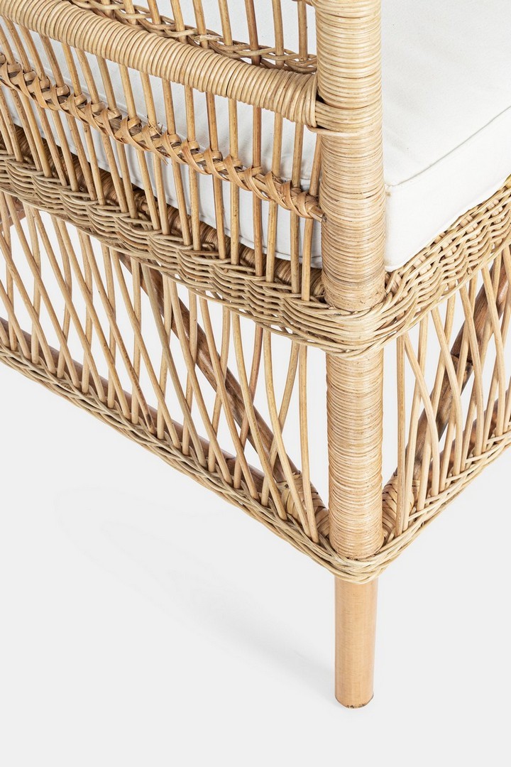 RATTAN. RIFINITURA CON VERNICE MELAMINICA. CUSCINO SFODERABILE CON TESSUTO IN COTONE. SI RACCOMANDA DI NON ESPORRE L'ARTICOLO ALLA LUCE DIRETTA DEL SOLE ED ALLE INTEMPERIE. IMBALLO SENZA CARTONE.