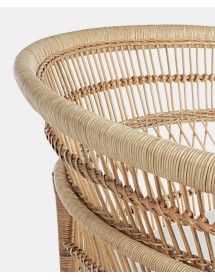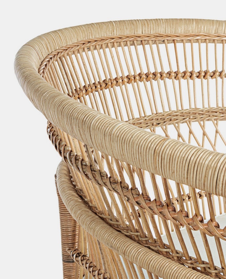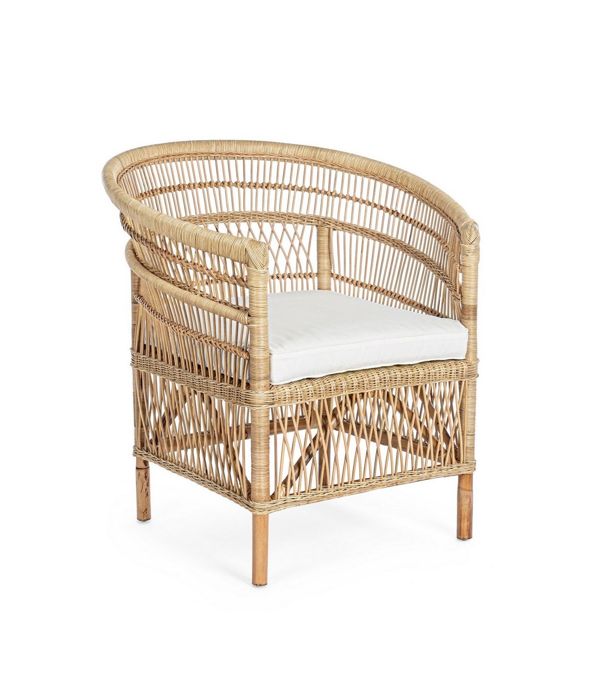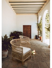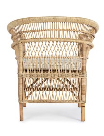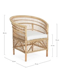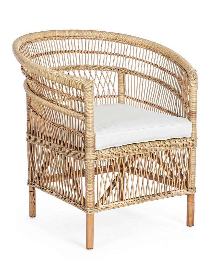 RATTAN. RIFINITURA CON VERNICE MELAMINICA. CUSCINO SFODERABILE CON TESSUTO IN COTONE. SI RACCOMANDA DI NON ESPORRE L'ARTICOLO ALLA LUCE DIRETTA DEL SOLE ED ALLE INTEMPERIE. IMBALLO SENZA CARTONE.