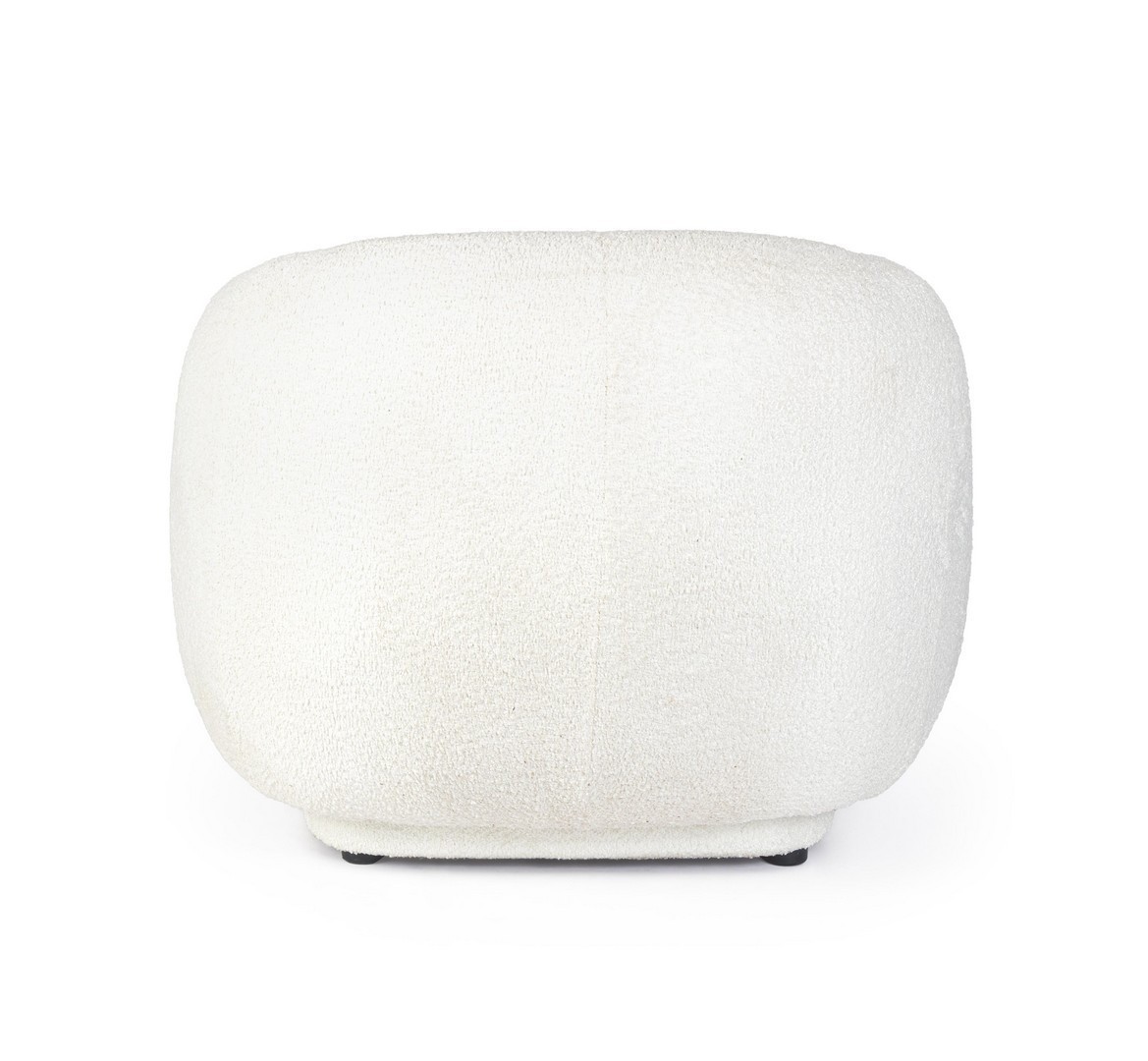 STRUTTURA IN COMPENSATO. RIVESTIMENTO IN POLIESTERE EFFETTO BOUCLE'. IMBOTTITURA IN SCHIUMA POLIURETANICA (DENSITA' 25KG/M3 SEDUTA, 18KG/M3 SCHIENALE).