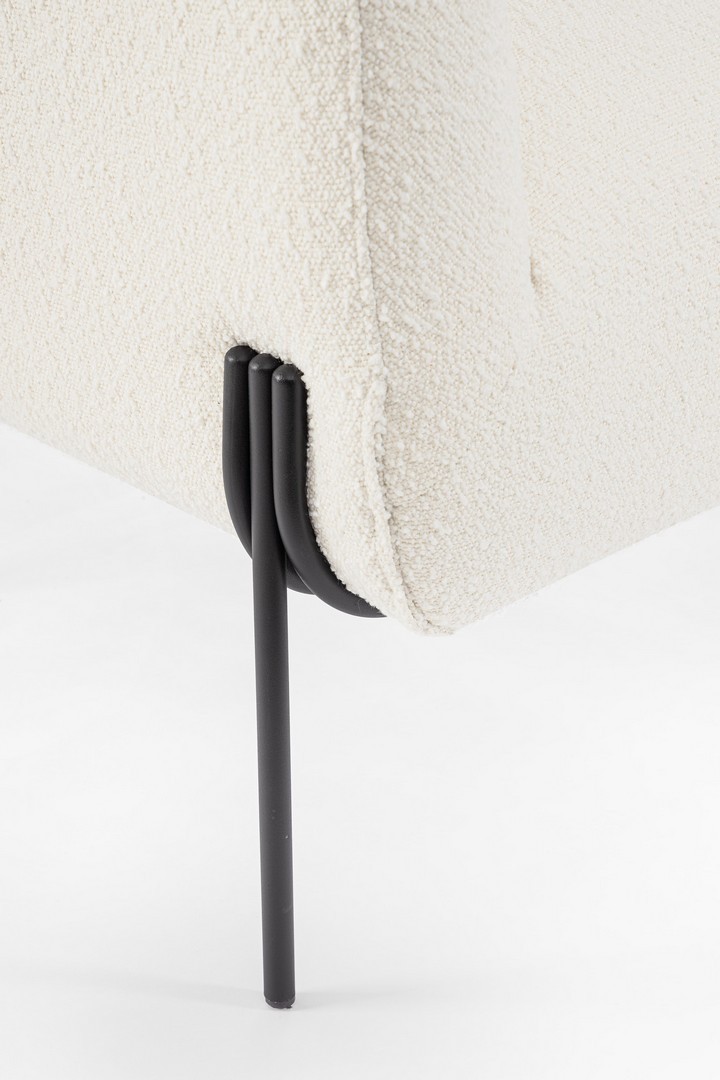 STRUTTURA IN LEGNO COMPENSATO, GAMBE IN ACCIAIO VERNICIATO A POLVERE EPOSSIDICA. RIVESTIMENTO IN POLIESTERE EFFETTO BOUCLE'. DENSITA' IMBOTTITURA SEDUTA 28KG/M3 SCHIENALE 20KG/M3. NON SFODERABILE. GAMBE DA ASSEMBLARE.