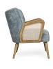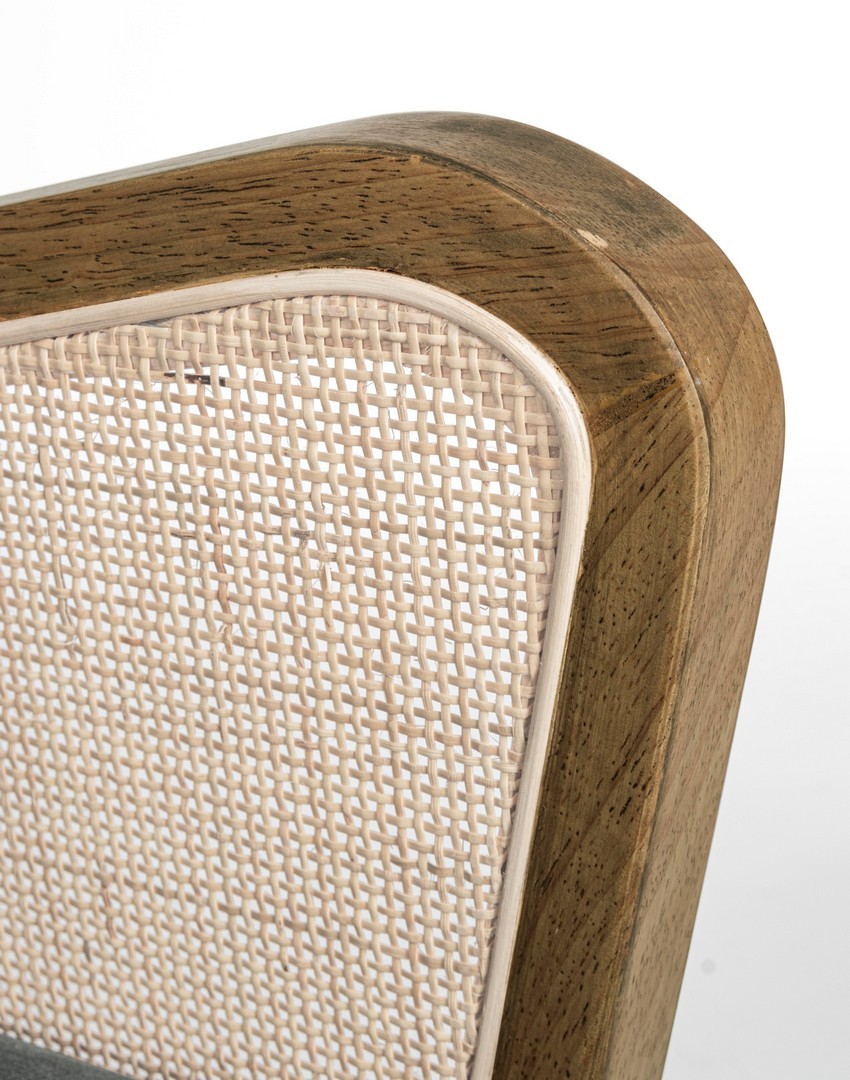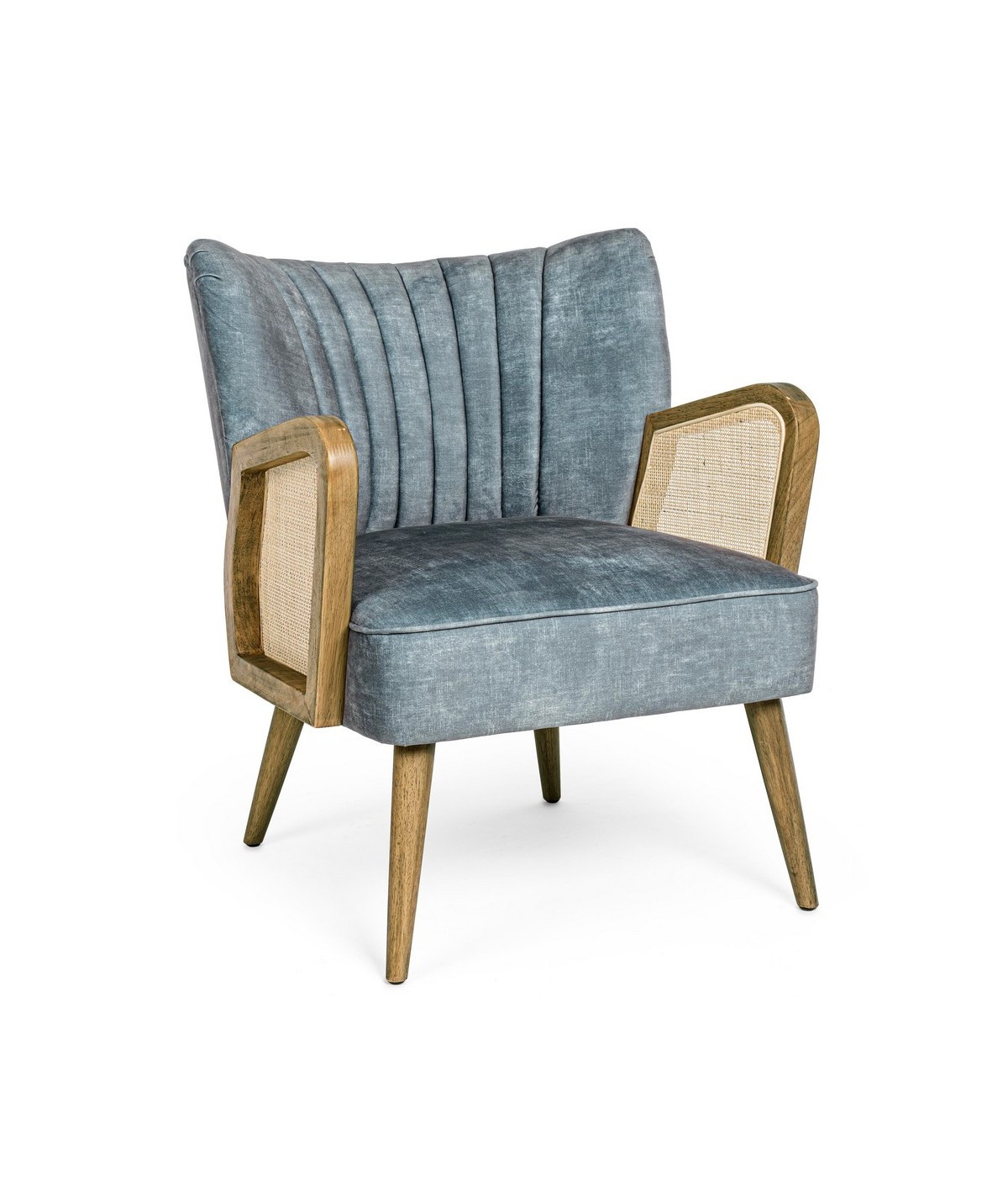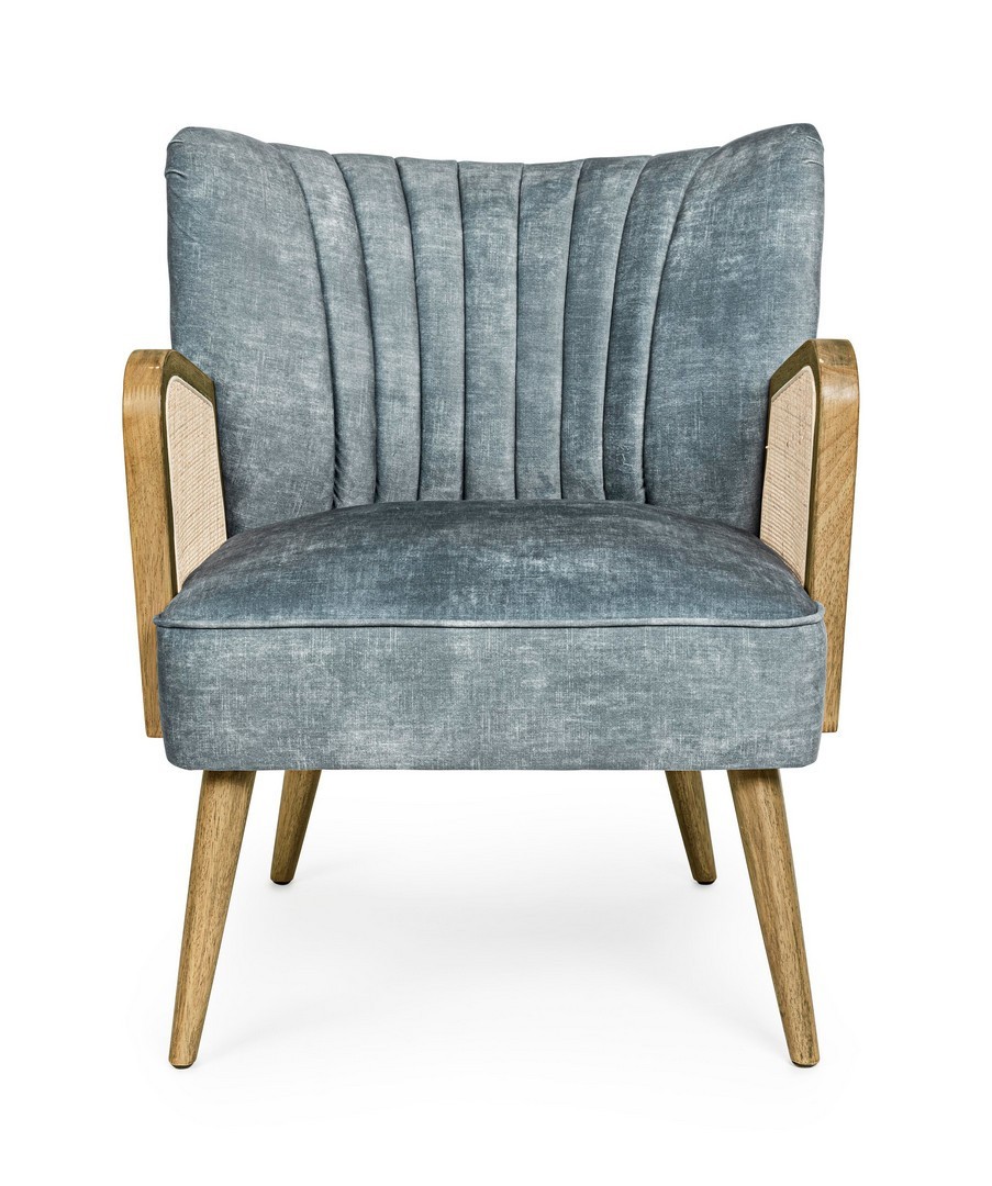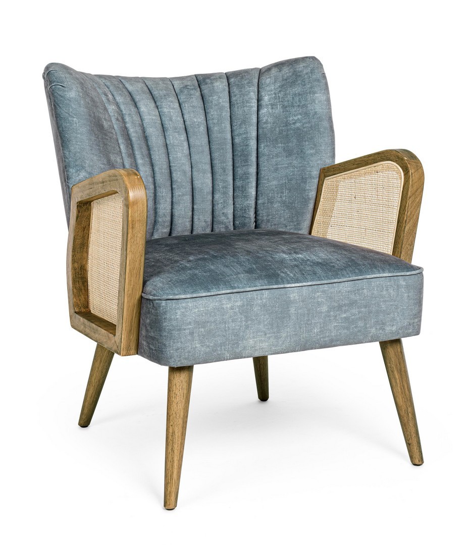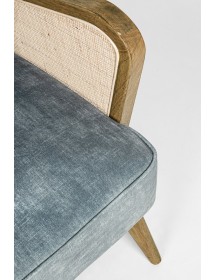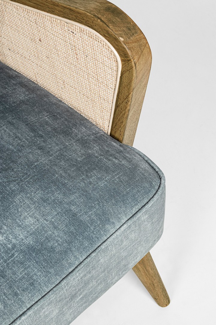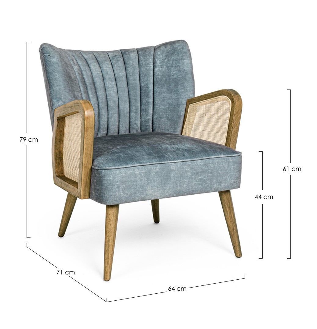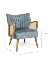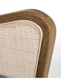 STRUTTURA IN LEGNO DI PINO E COMPENSATO. GAMBE IN RUBBERWOOD. BRACCIOLI CON INSERTI IN RATTAN. RIVESTIMENTO IN POLIESTERE. DENSITA' IMBOTTITURA IN SCHIUMA POLIURETANICA 24 KG/M3. NON SFODERABILE. GAMBE DA ASSEMBLARE.