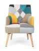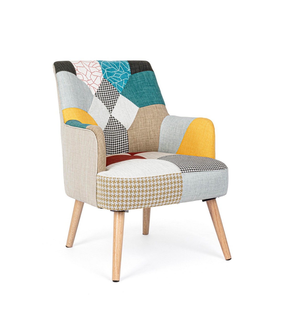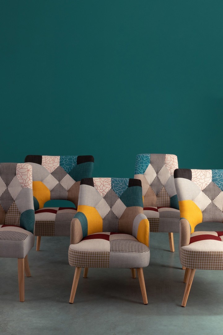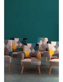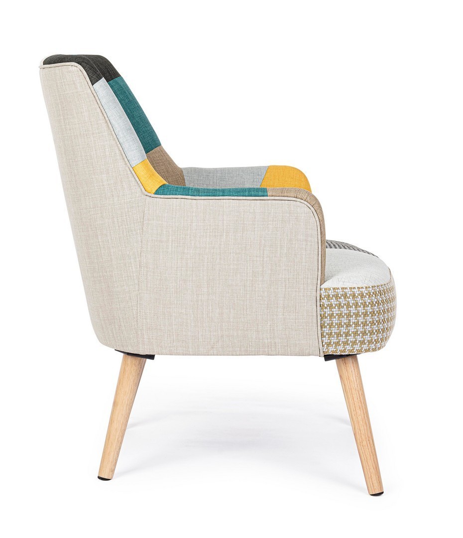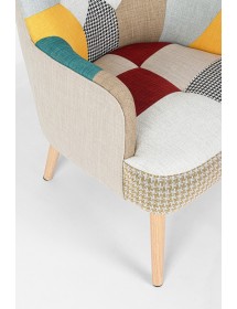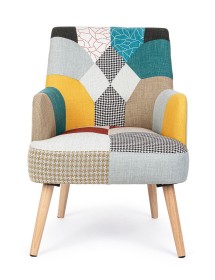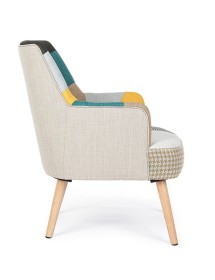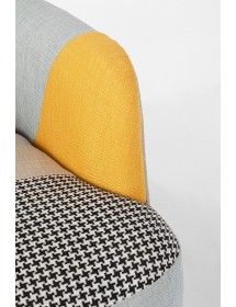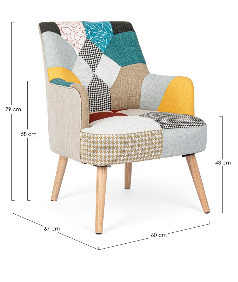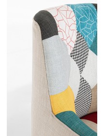 STRUTTURA IN RUBBERWOOD E COMPENSATO, VERNICIATURA A BASE DI NITROCELLULOSA. RIVESTIMENTO IN POLIESTERE CON LAVORAZIONE PATCHWORK. DENSITA' IMBOTTITURA SEDUTA 36KG/M3. GAMBE DA ASSEMBLARE.