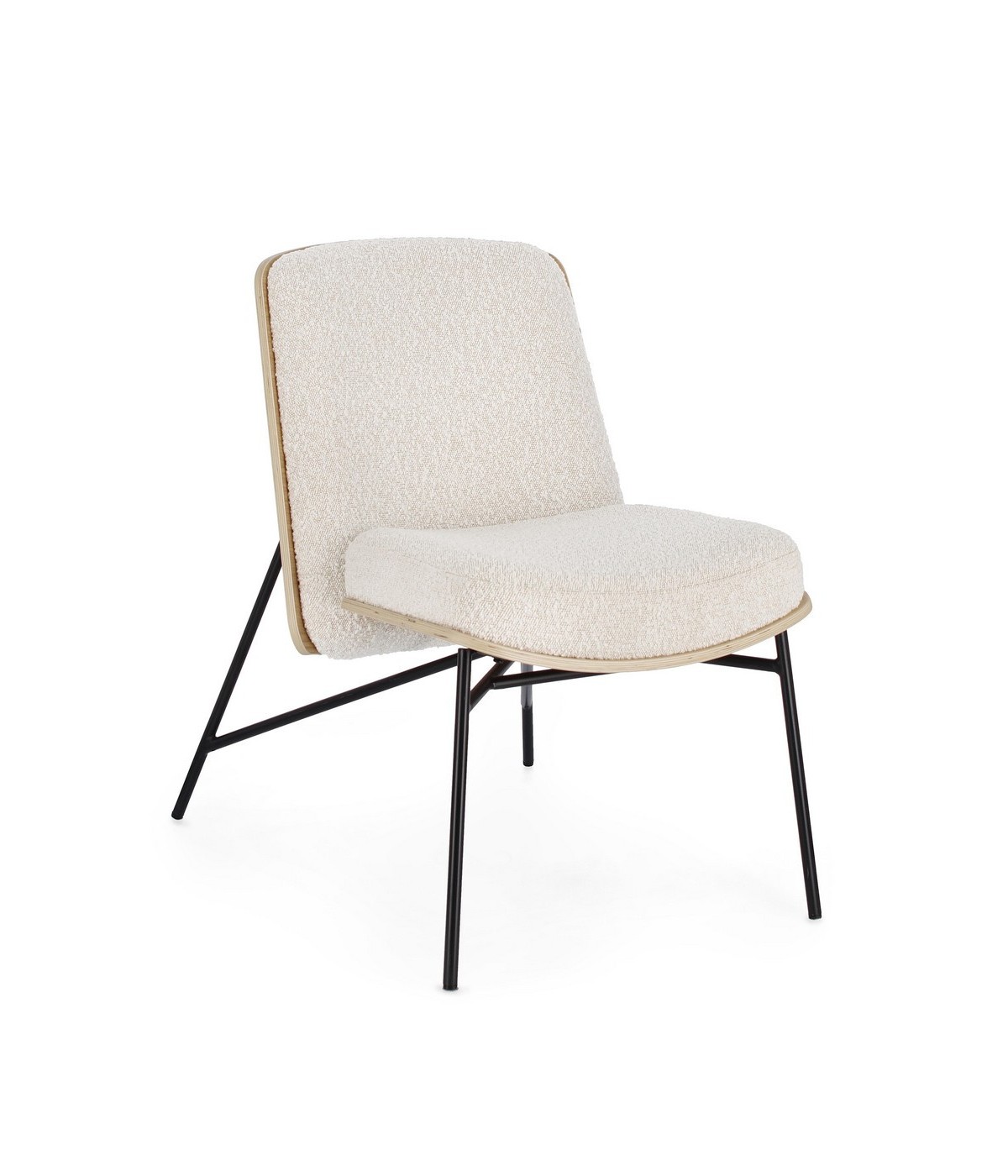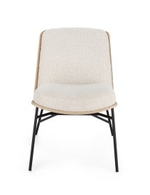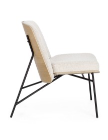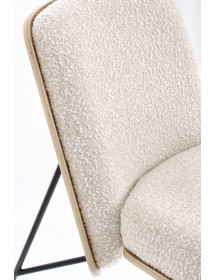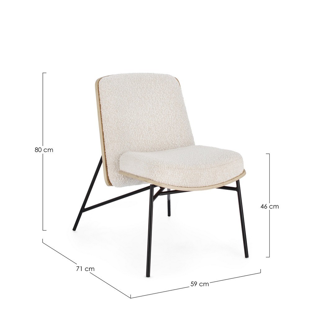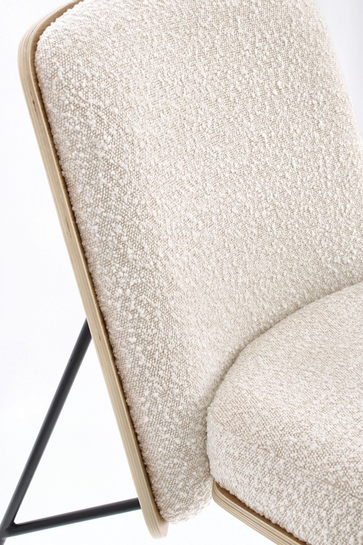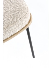 STRUTTURA IN COMPENSATO. GAMBE IN ACCIAIO VERNICIATO A POLVERE. IMBOTTITURA IN SCHIUMA POLIURETANICA. RIVESTIMENTO IN 95% POLIESTERE 5% ACRILICO EFFETTO BOUCLE' . GAMBE DA ASSEMBLARE.