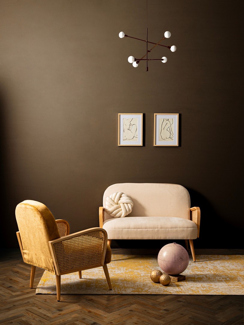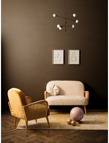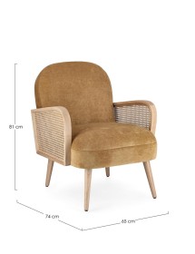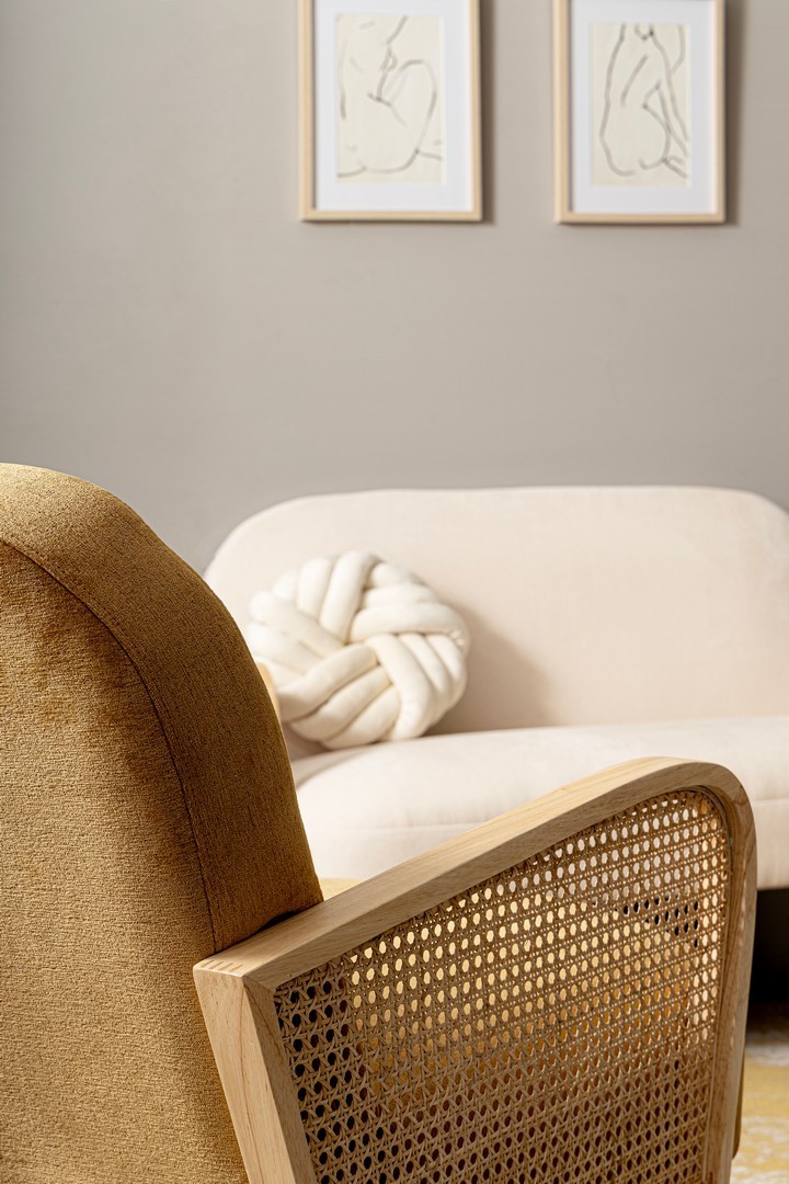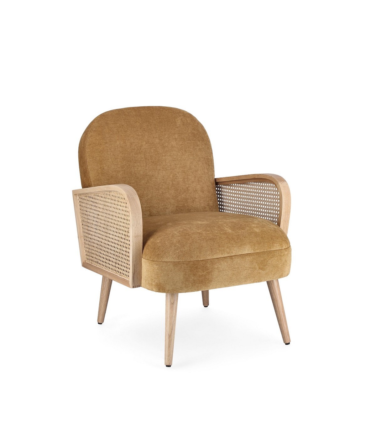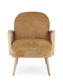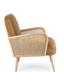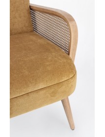 STRUTTURA IN LEGNO DI PINO E COMPENSATO. GAMBE IN RUBBERWOOD. BRACCIOLI CON INSERTI IN RATTAN. RIVESTIMENTO IN POLIESTERE. DENSITA' IMBOTTITURA IN SCHIUMA POLIURETANICA 24 KG/M3. NON SFODERABILE. GAMBE DA ASSEMBLARE.
