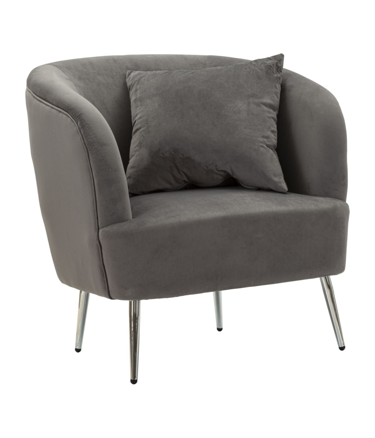 Poltrona grigia con gambe argentate da assemblare, rivestita in morbido velluto. Ideale per ambienti moderni e raffinati, aggiunge un tocco di lusso e comfort.