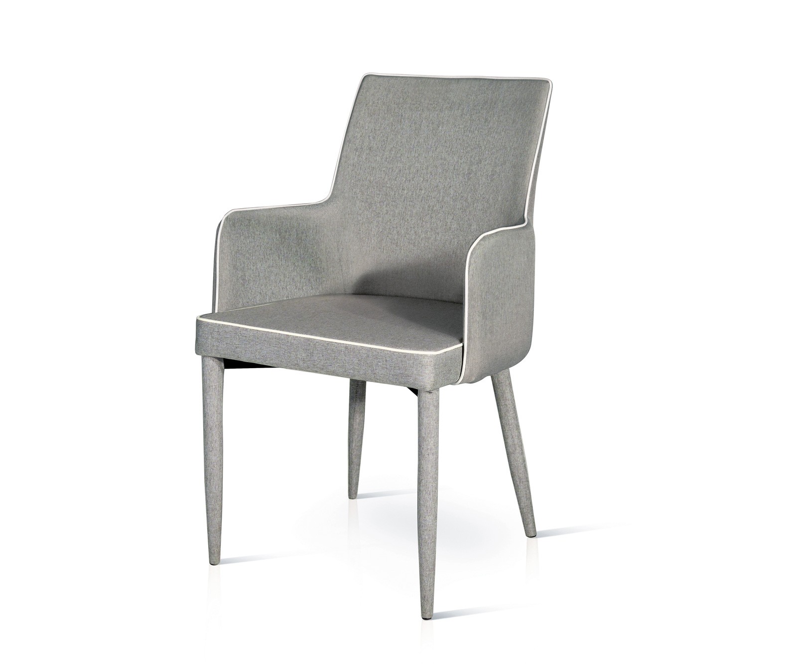Poltroncina con braccioli, seduta e schienale imbottiti in poliuretano espanso e rivestita in tessuto tortora con profilo bianco che va in contrasto e le dona un design elegante e unico nel suo genere.