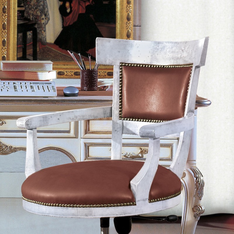 Poltrona girevole in legno ideale per chi ama arredare in stile classico la casa, elegante e versatile da posizionare in qualsiasi stanza . Poltrona Caratterizzata da una leva sotto la seduta che permette di posizionare l'altezza desiderata e provvista di ruote per i vari spostamenti. Schienale e seduta sagomata con applicazione di borchie, imbottita per garantire un' esperienza di seduta confortevole e unica. Complemento di arredo che non può mancare nella zona living e che si contraddistingue per la sua originalità.