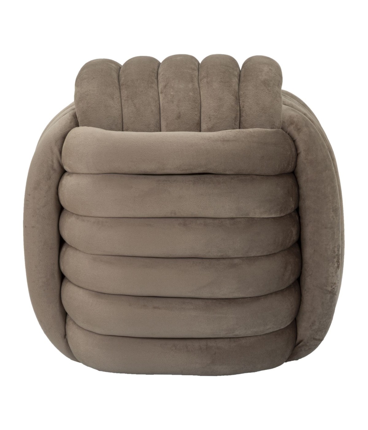 Pouff annodato in velluto grigio invita al relax con una sensazione accogliente e una nota di eleganza vibrante.