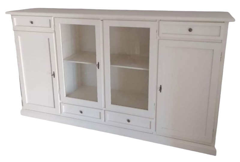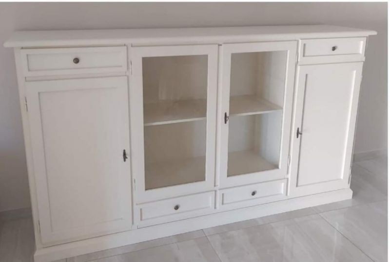 Credenza shabby in arte povera 4 porte 4 cassetti per il riordino di stoviglie e oggetti. Solida e Capiente ma allo stesso funzionale , adatta per creare un'impatto estetico con le 2 porte centrali in vetro unica nel suo genere . Credenza che rappresenta la soluzione ideale per arredare con gusto qualsiasi stanza della casa.