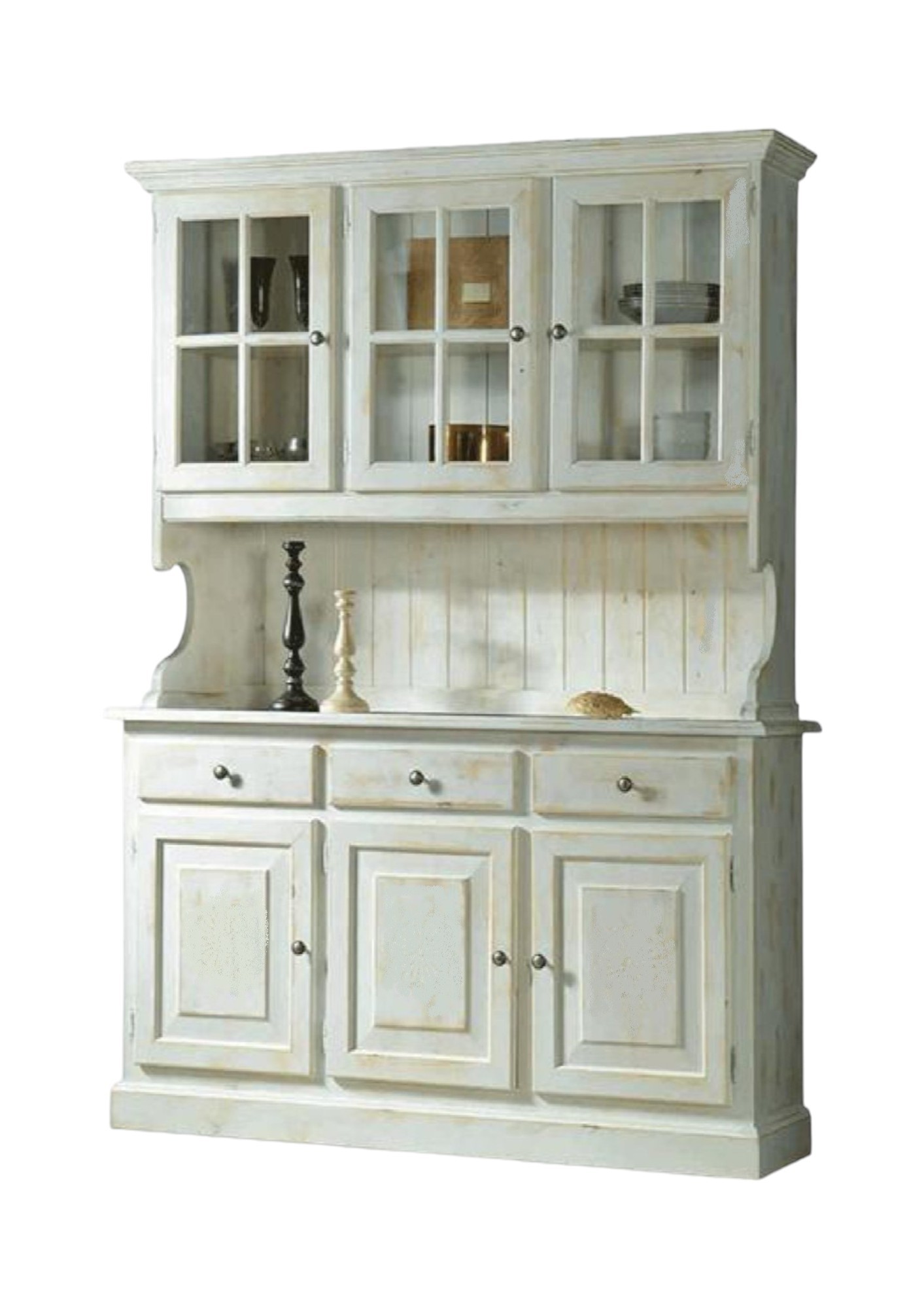 Cristalliera con 6 ante e 3 cassetti con vetrina superiore con 3 ante in vetro all' inglese e vano a giorno perlinato. Zoccolo a terra, in perfetto stile country, sono un classico che si adatta ad ogni ambiente.