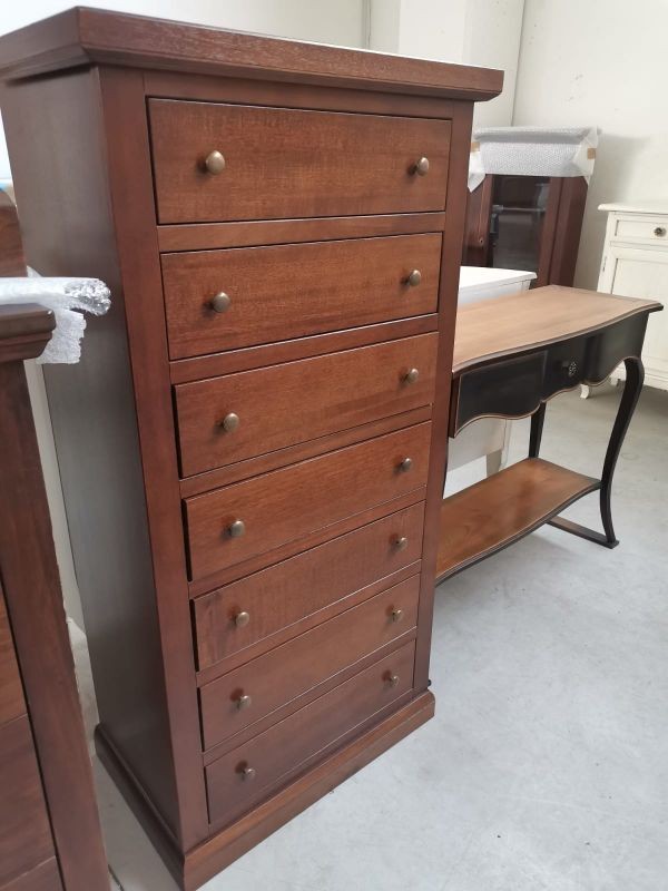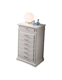 Cassettiera dalle linee semplici e pulite costruita in legno con zoccolo a terra. Cassettiera dotata di sette cassetti per riporre all'occorrenza biancheria intima e oggetti. Trovano facilmente posto nella zona notte proteggendo con i suoi cassetti il suo contenuto all'interno. Unica nel suo genere grazie alle sue linee eleganti dando un tocco a un' atmosfera dallo stile classico.