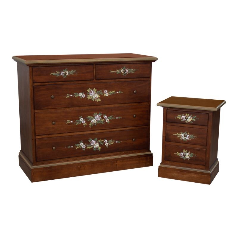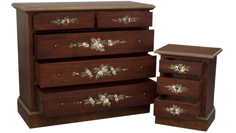 Gruppo cassettiera e Comodini costruiti in legno con angoli a becco di civetta e zoccolo a terra. Cassettiera e comodini dotati di cassetti per riporre all'occorrenza biancheria intima e oggetti. Trovano facilmente posto nella zona notte proteggendo con i suoi cassetti il suo contenuto all'interno. Unici nel loro genere con la sua particolare verniciatura tinta noce con decori floreali dando un tocco a un' atmosfera dallo stile tirolese.