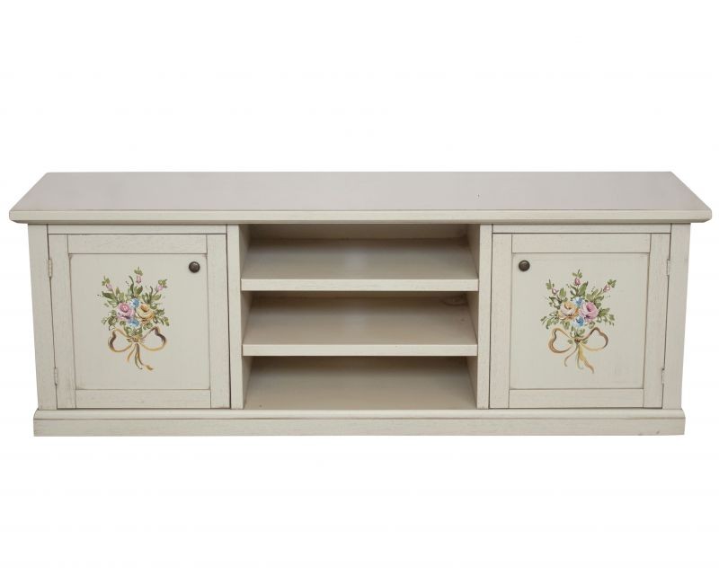 DESCRIZIONE : Porta Tv 2 ripiani e 2 ante laccato interamente colore bianco opaco con decori floreali.