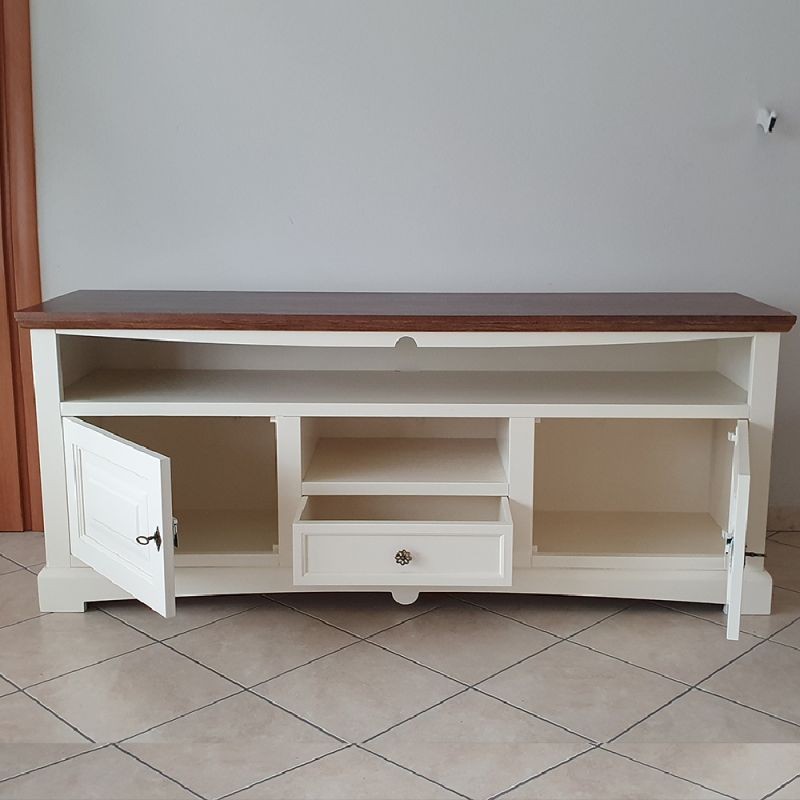 Mobile porta tv in stile classico adatto per appoggiare la televisione e con il vano a giorno sottostante per riporre oggetti di vario tipo. Elemento d' arredo funzionale e spazioso che ti permetterà di risolvere i problemi di spazio grazie alle porte e al cassetto, aggiungendo un tocco di classe per le sue linee eleganti che non passerà inosservato dagli ospiti all' interno della casa .
