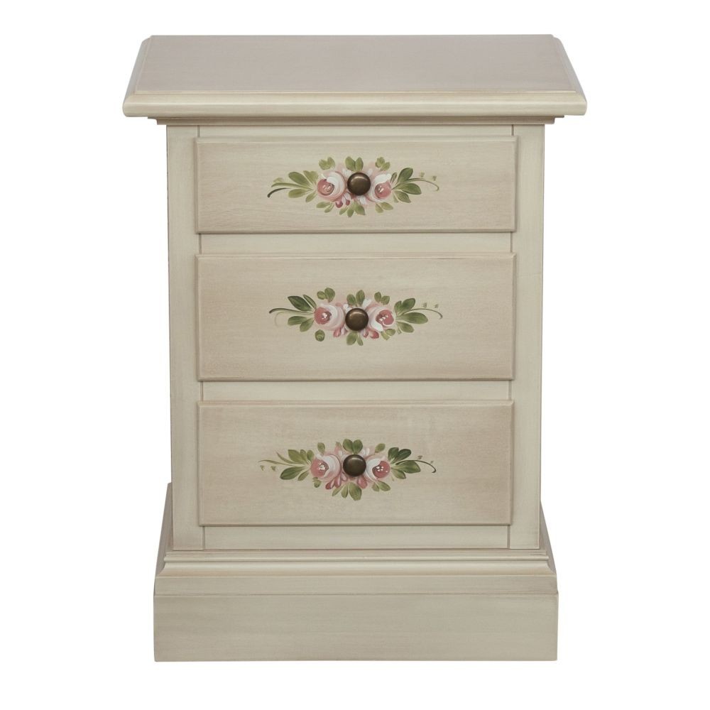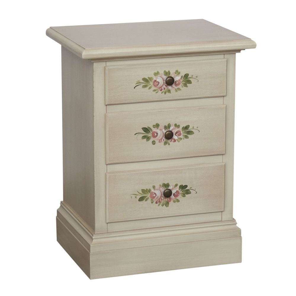 Comodino in stile shabby costruito in legno rendendo il mobile solido e allo stesso tempo elegante. Dotato di 3 cassetti con zoccolo a terra, Ideale per la zona giorno, per l'entrata per riporre il telefono o come comodino per la zona notte. Unica nel suo genere con i suoi decori floreali dando un tocco a un' atmosfera dallo stile d'altri tempi .
