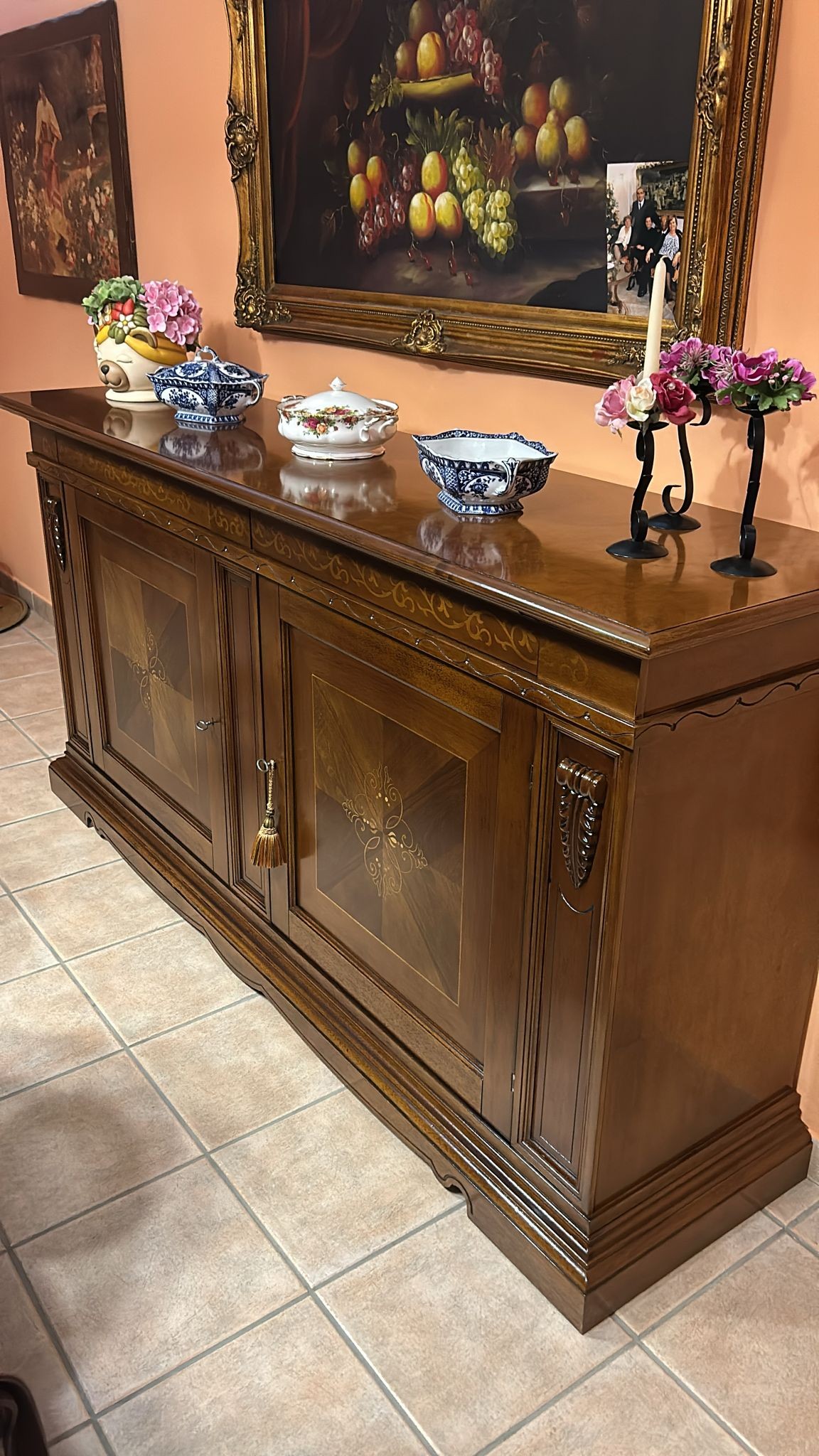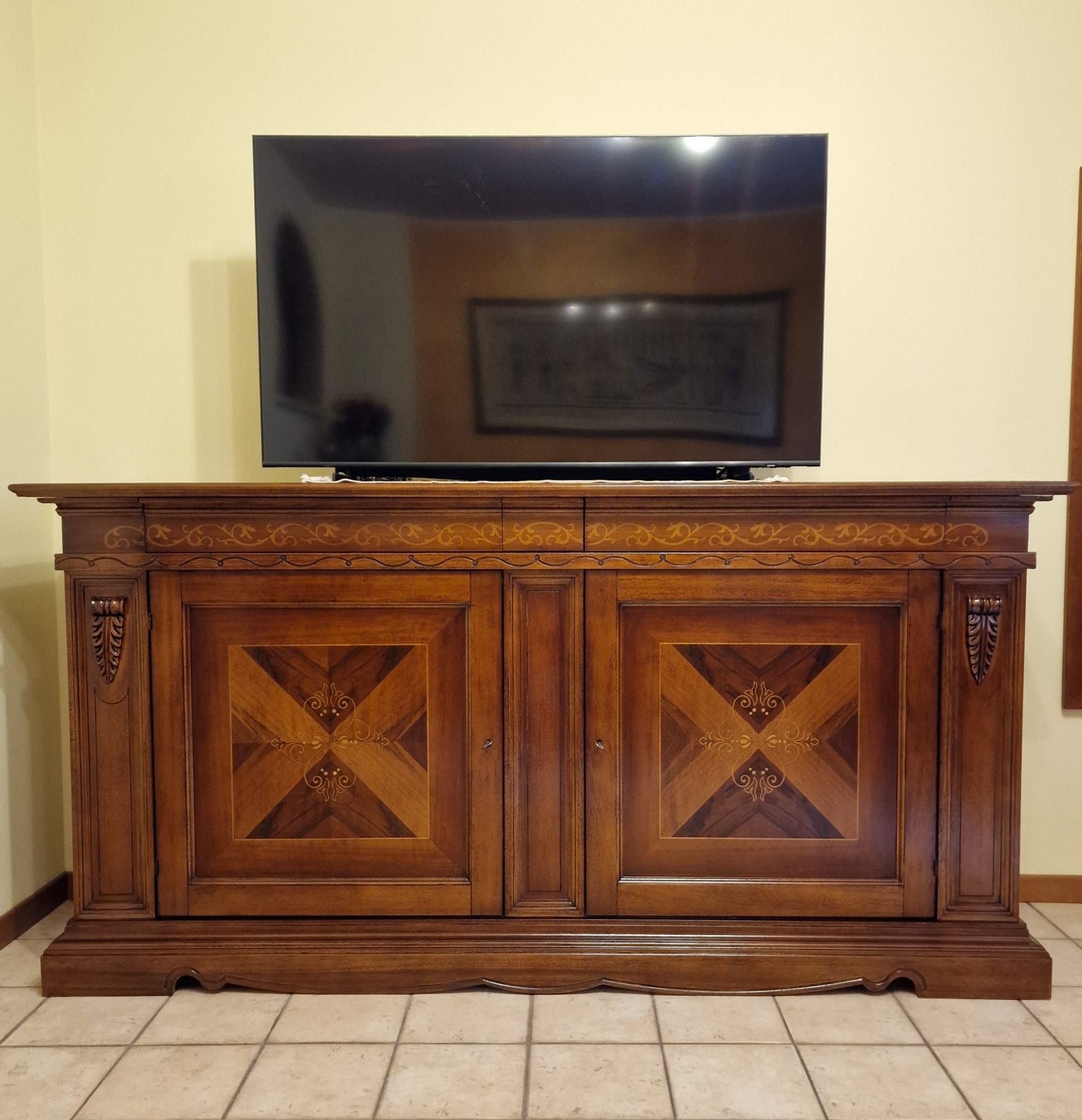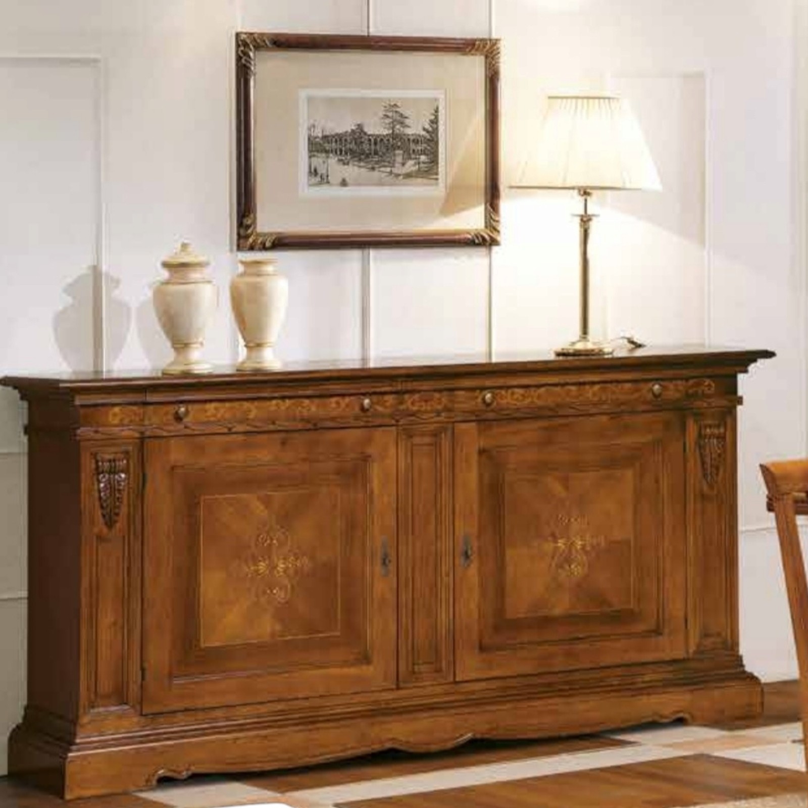 - Caratteristiche: 2 ante in legno con intarsio, 2 cassetti in legno.