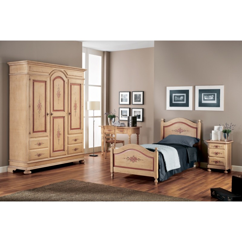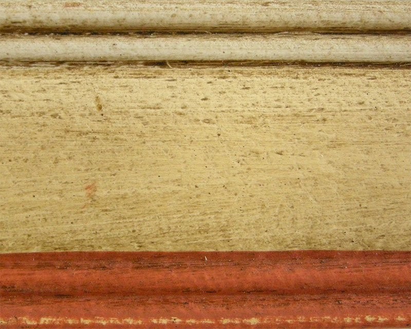 Finitura: particolare laccatura artigianale con fondo colore avorio antico ed ornamenti colore rosso antico, anticati con particolari lavorazioni e patine. Cerati a mano