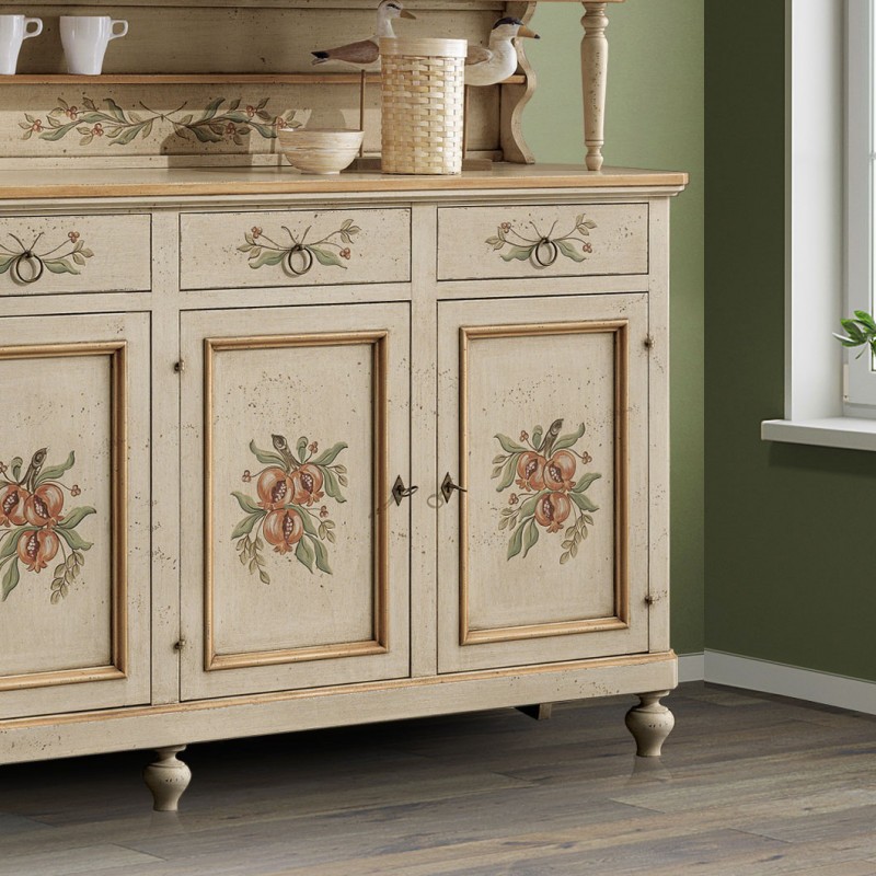Finitura: particolare laccatura colore avorio ed ornamenti colore ocra antico. anticati con particolari lavorazioni e patine, cerati a mano.
