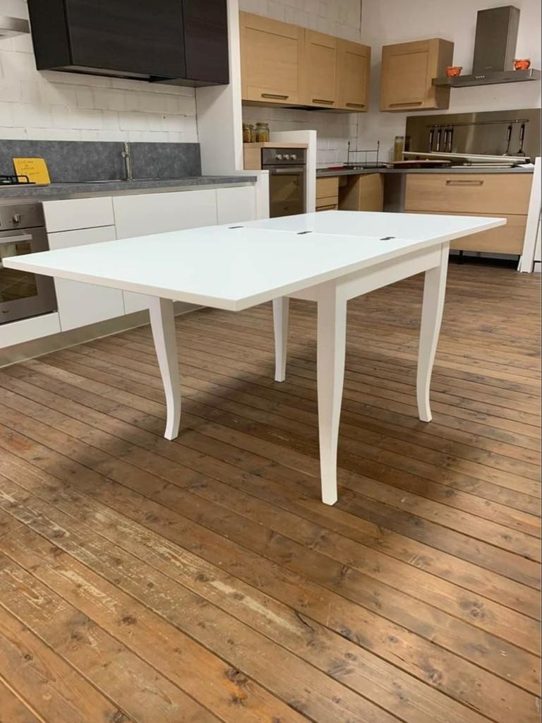 Tavolo costruito in legno massello di pioppo rendendo il mobile solido e allo stesso tempo elegante. Piano quadrato con gambe a sciabola. Dotato di un'apertura a libro con scorrimento per ospitare occasionalmente numerose persone per il pranzo o per la cena. Ideale per il soggiorno o in cucina.