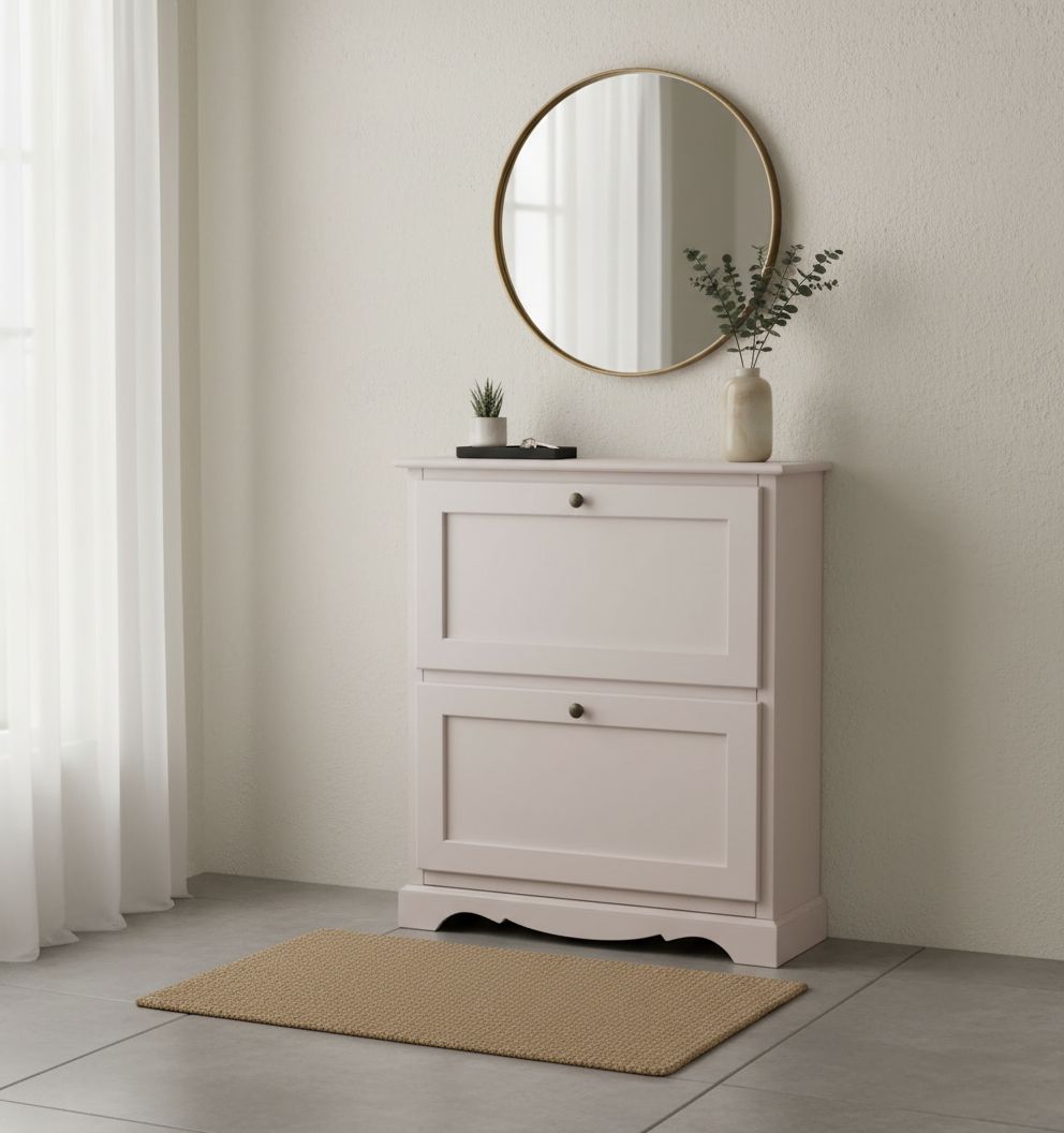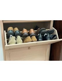 Scarpiera in legno di pioppo rendendo il mobile solido e robusto. Piano rettangolare con fianchi lisci e zoccolo sagomato. Scarpiera con ante a ribalta per riporre all'interno svariate scarpe all' ultimo momento. Adattabile a qualsiasi zona della casa per riporla in base alla spazio e alle esigenze mantenendo in ordine la stanza.