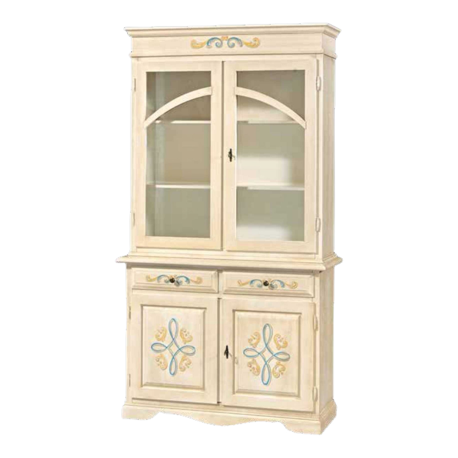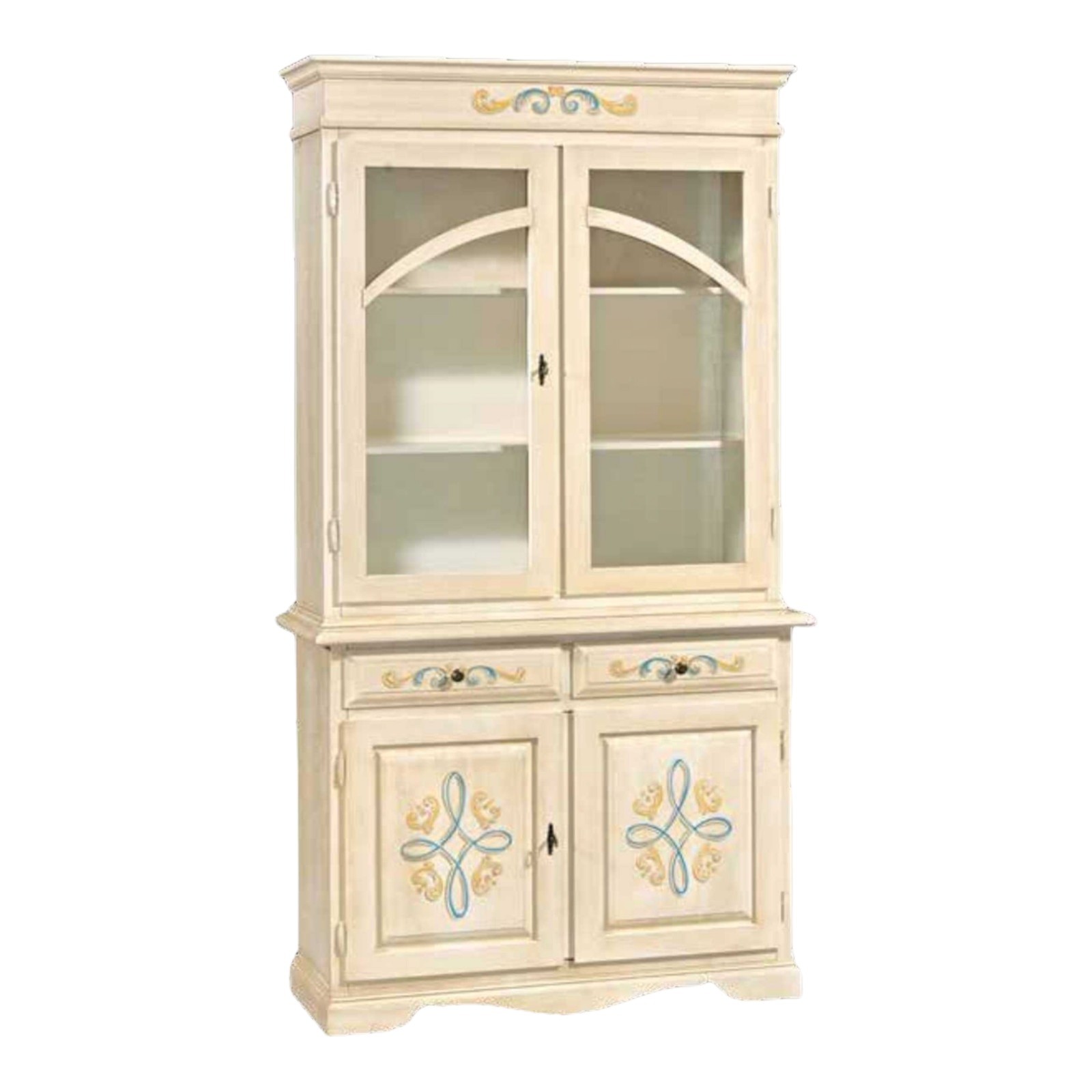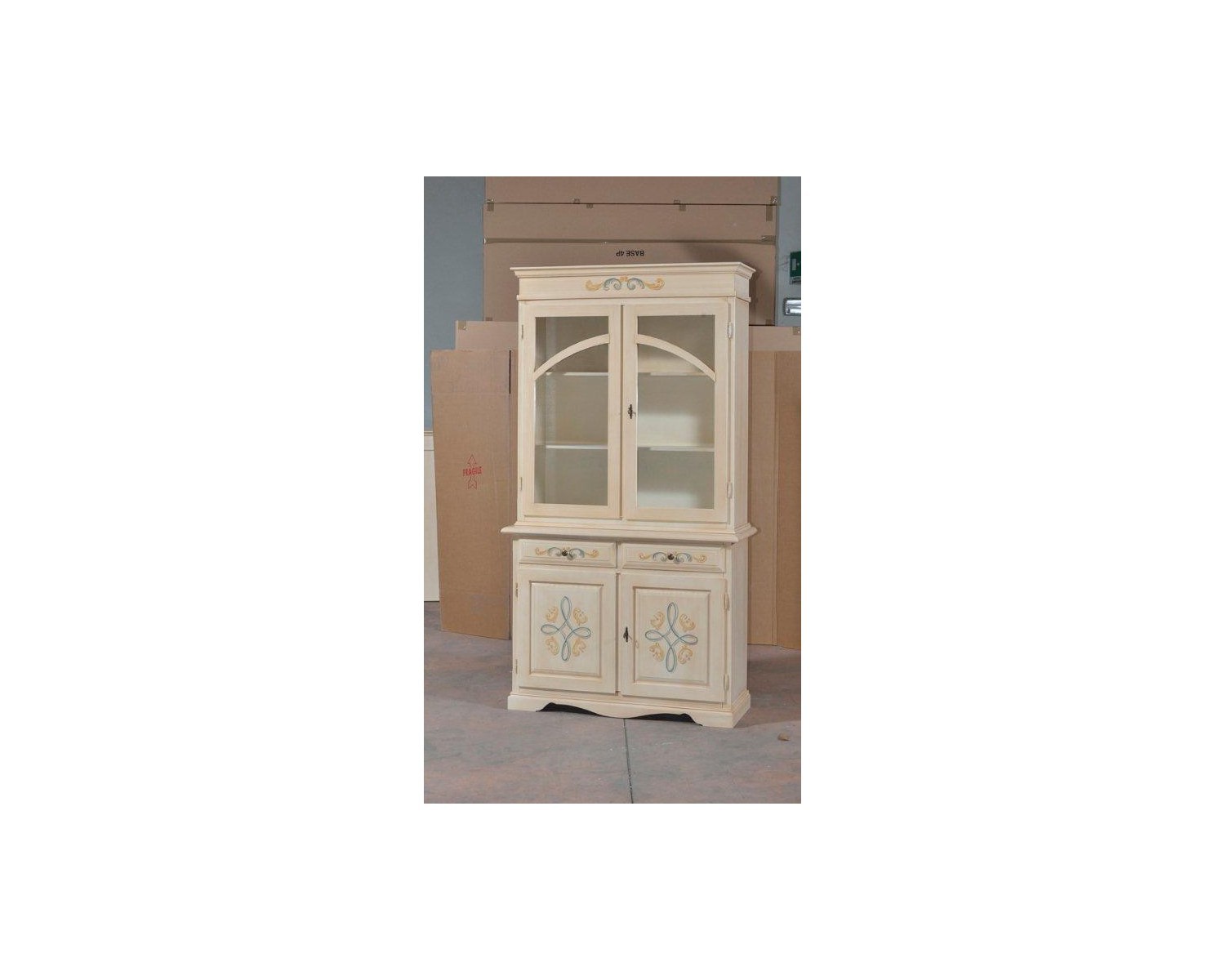 CRISTALLIERA CLASSICA 2 PORTE LEGNO AVORIO PENNELLATO E DECORI 105X42X205