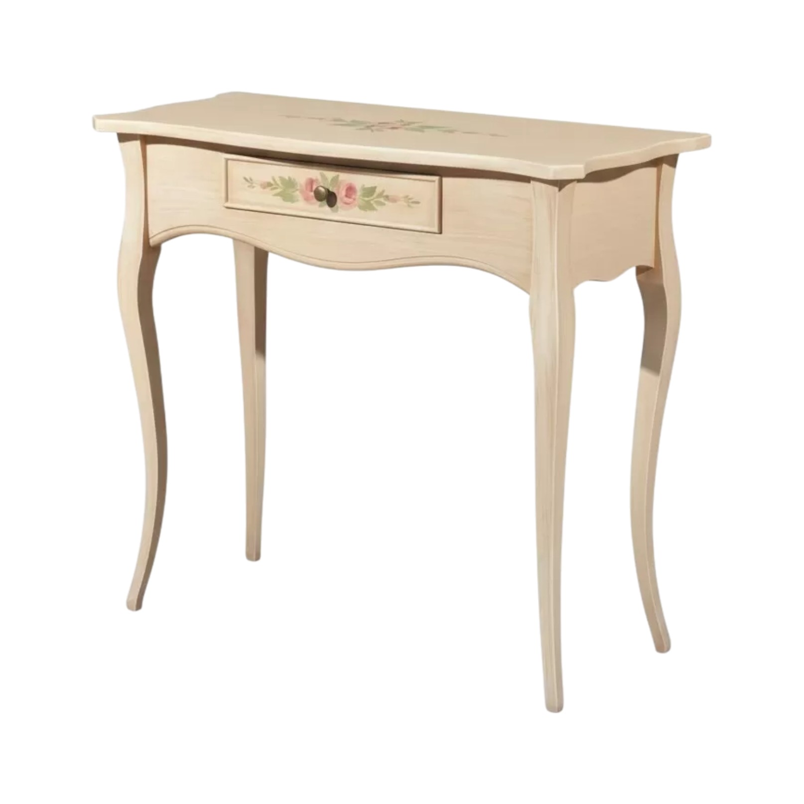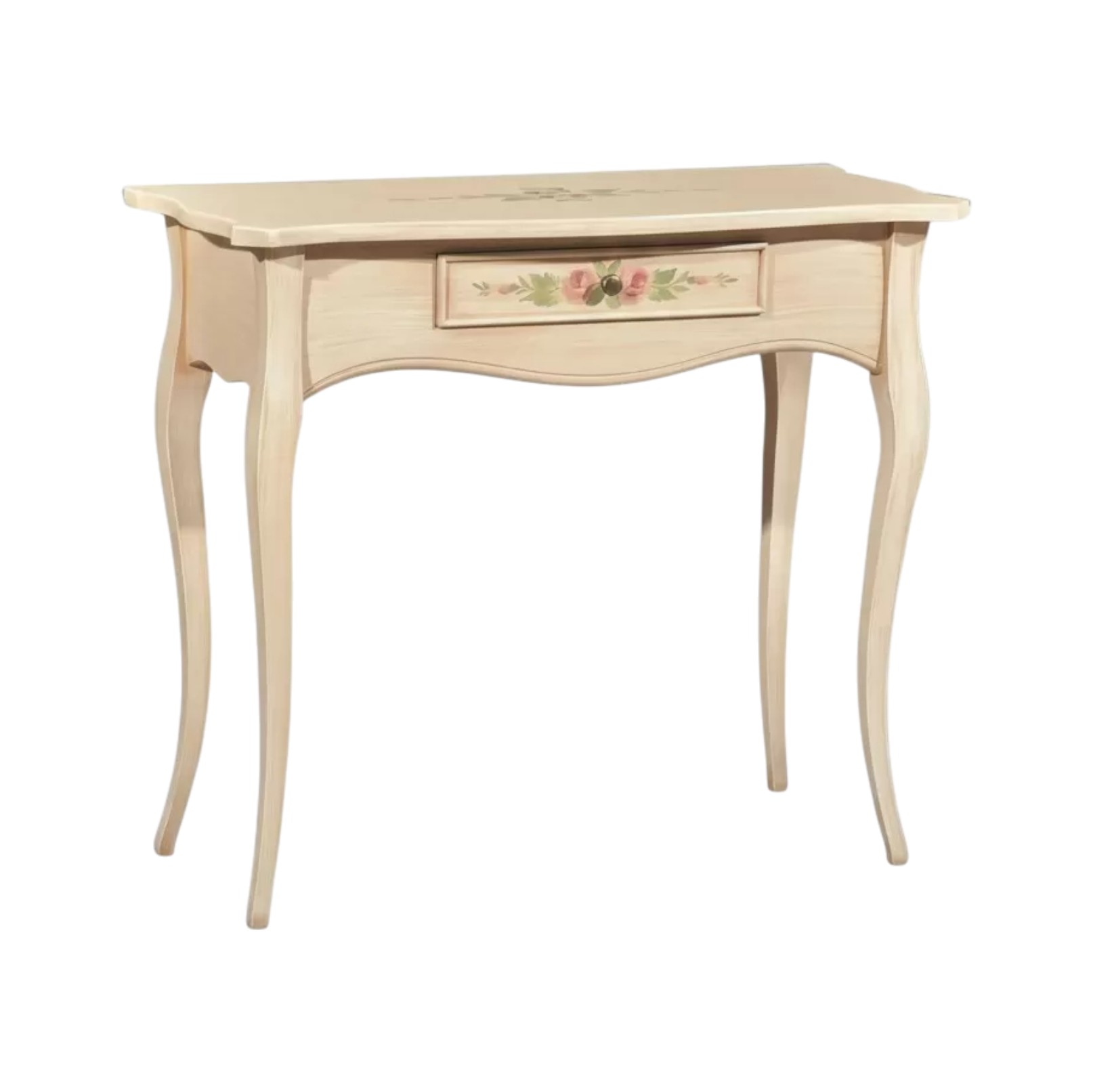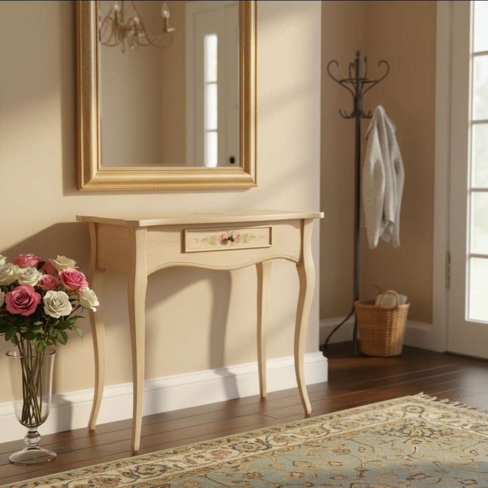 CONSOLLE LEGNO 1 CASSETTO AVORIO PATINATO DECORI 87x38x77